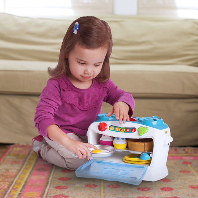 Vem com todos os ingredientes que as crianças precisam para horas de diversão fingida. Frite um ovo na frigideira e ouça sons de chiado! Asse pão, pizza e cupcakes na assadeira - a luz piscará quando a comida estiver pronta. Corte e sirva as guloseimas em pratos com a espátula para compartilhar com um amigo ou pai. Limpar é fácil quando as crianças já estão prontas - tudo cabe dentro.