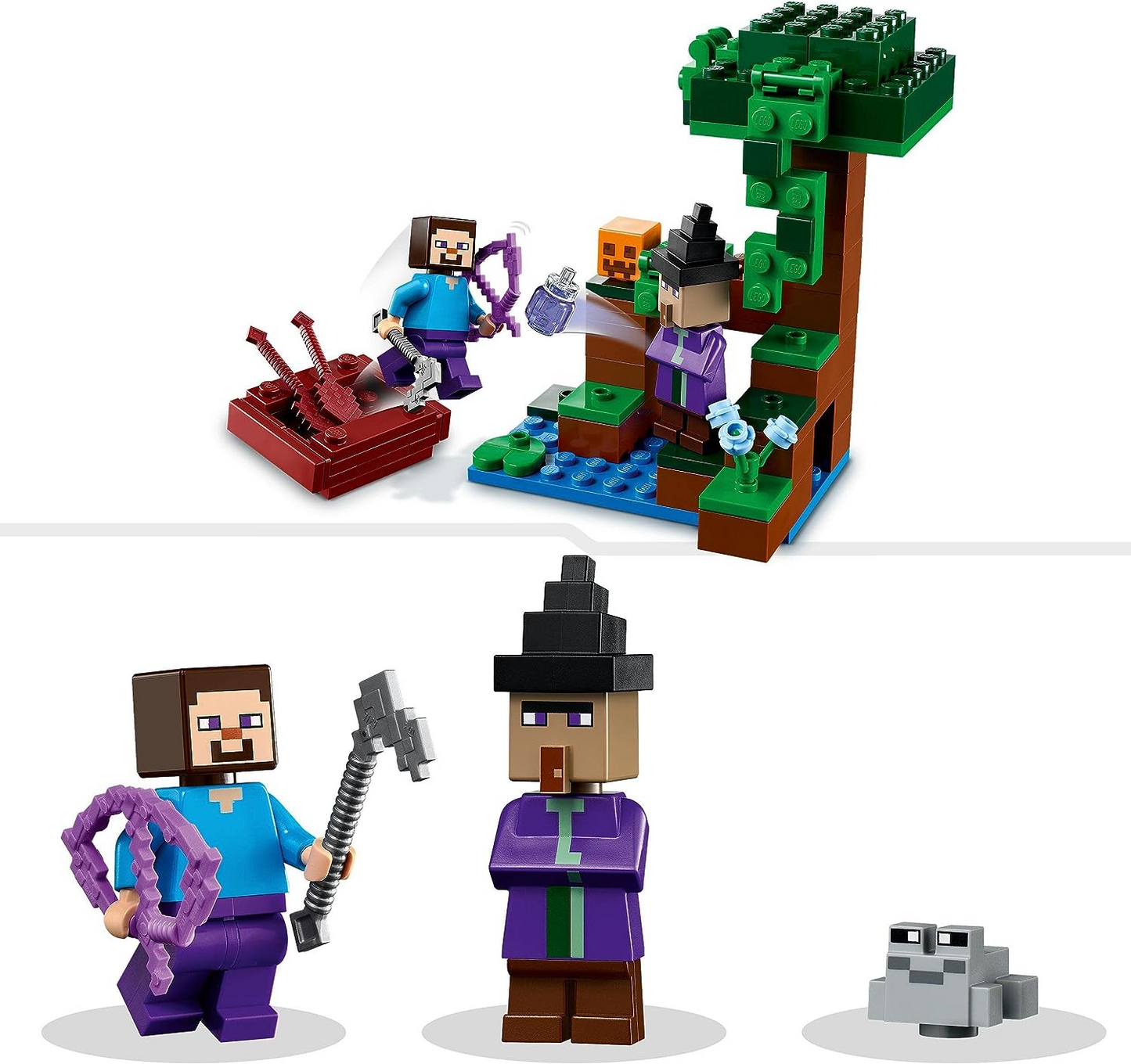 - O conjunto apresenta um dos personagens mais populares do Minecraft, Steve, com uma enxada e um arco, além de uma bruxa com poções e um sapo com crias de rãs.