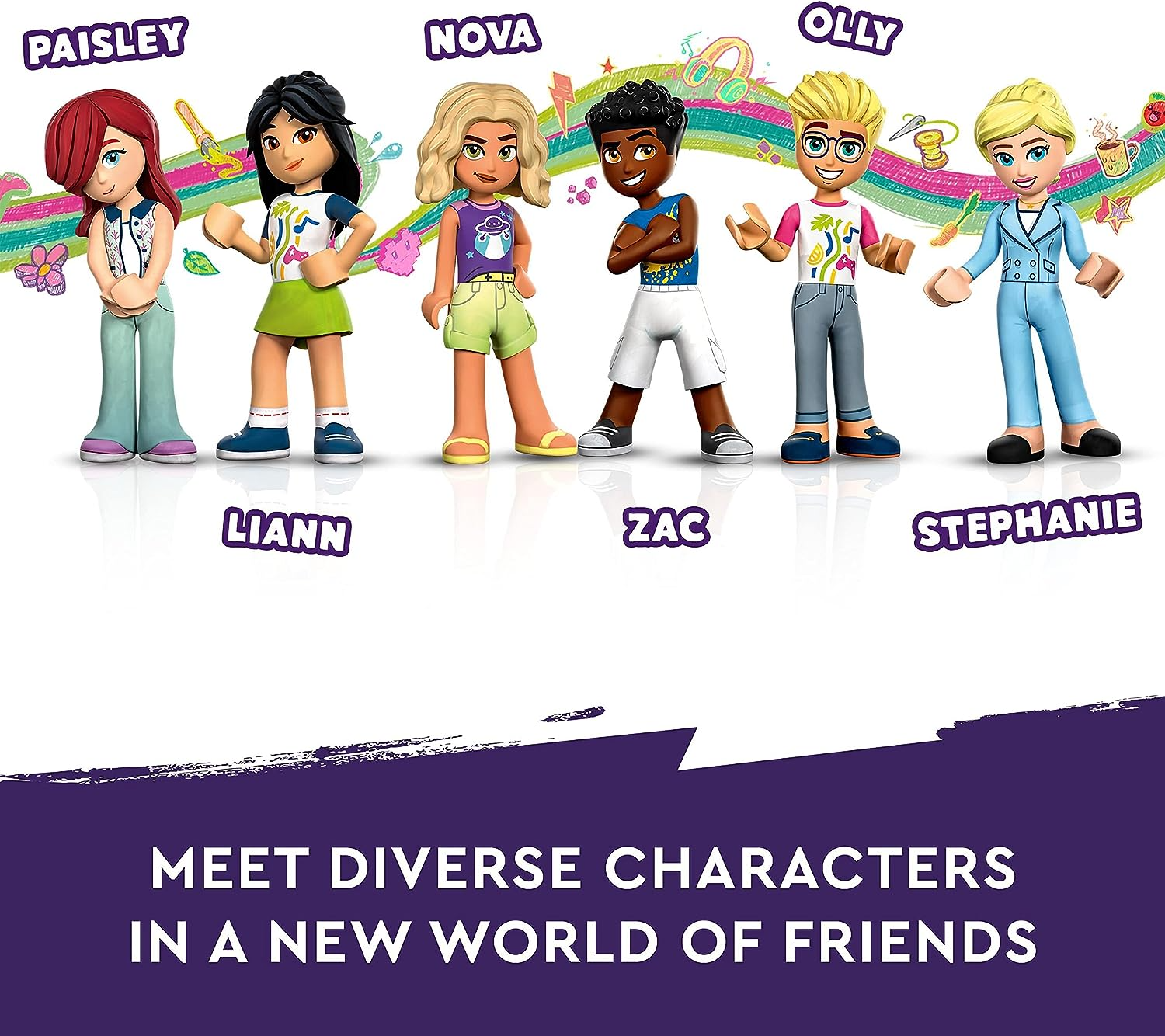 - Inclui minibonecos LEGO Friends Paisley, Liann, Olly, Nova, Zac e o cachorro Pickle, além de Stephanie, uma das personagens originais, que se tornou prefeita de Heartlake City