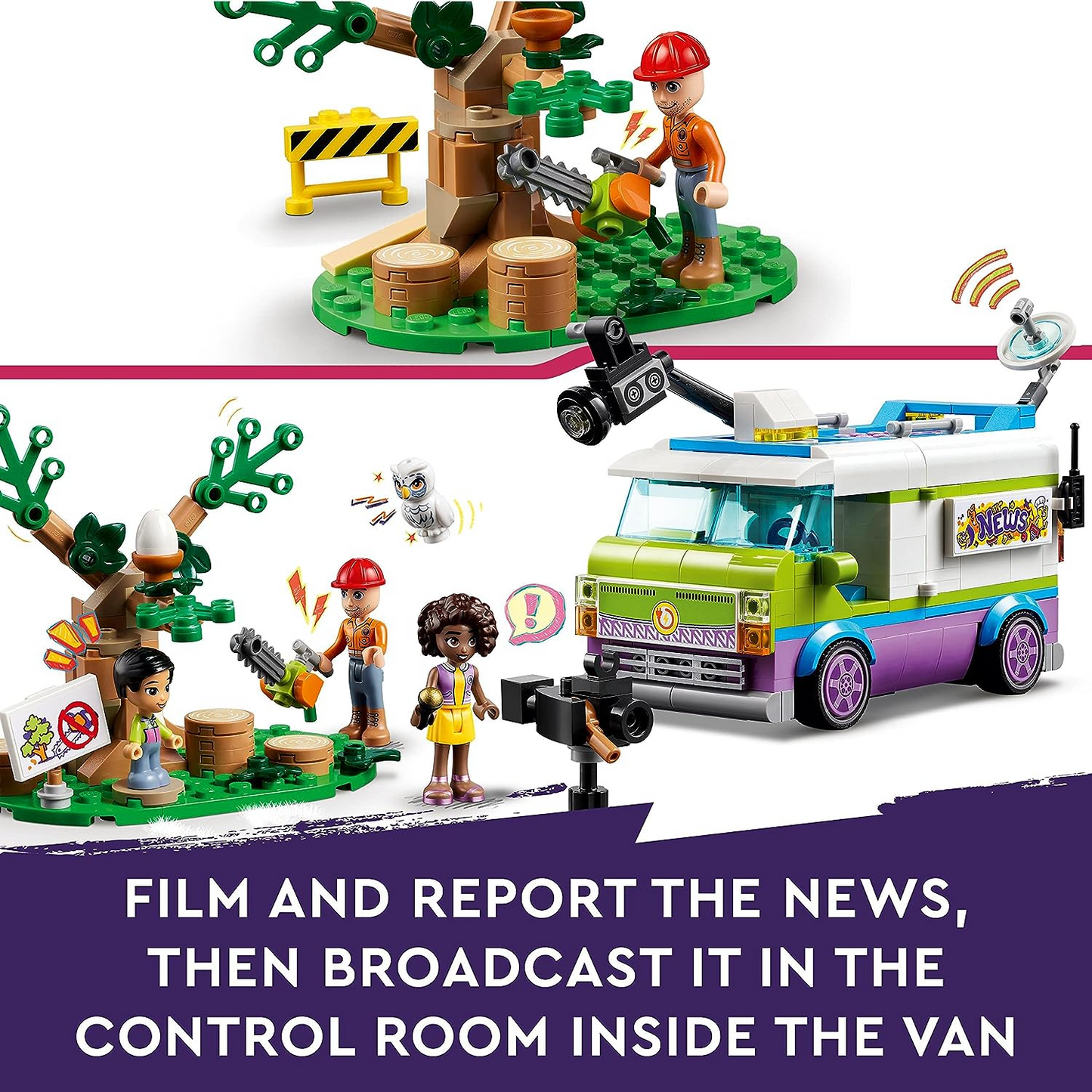 - O conjunto de van de brinquedo LEGO Friends apresenta caminhão de brinquedo que abre com centro de controle de notícias, uma coruja de brinquedo para resgatar e muitos acessórios de reportagem