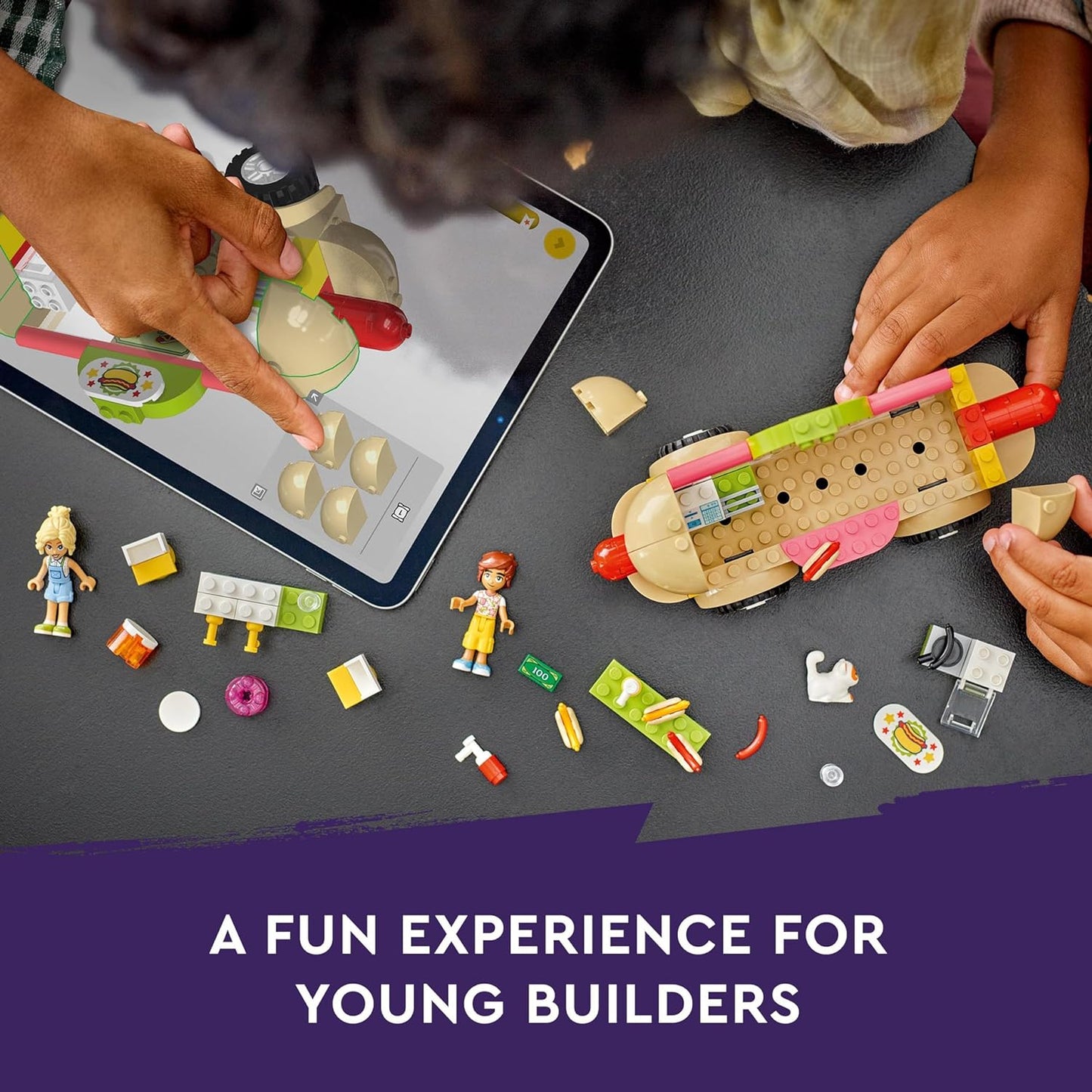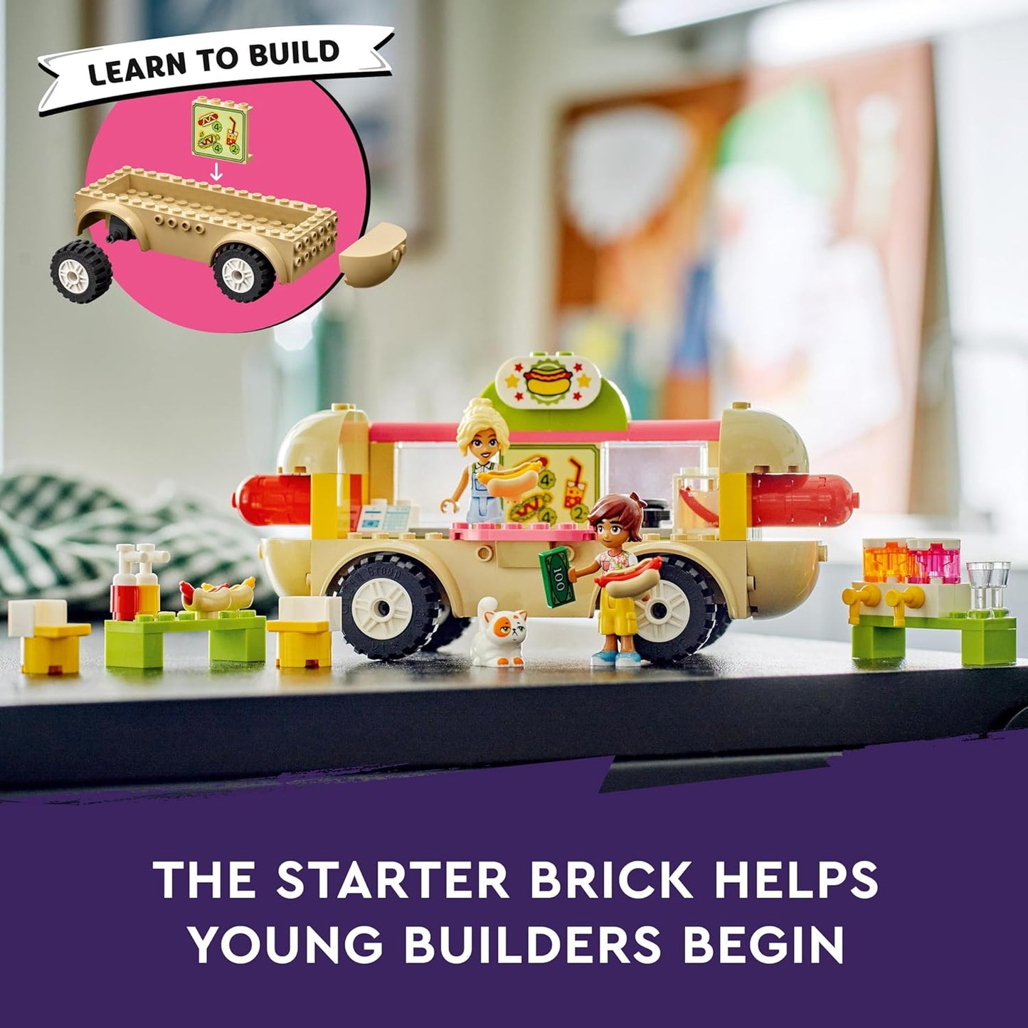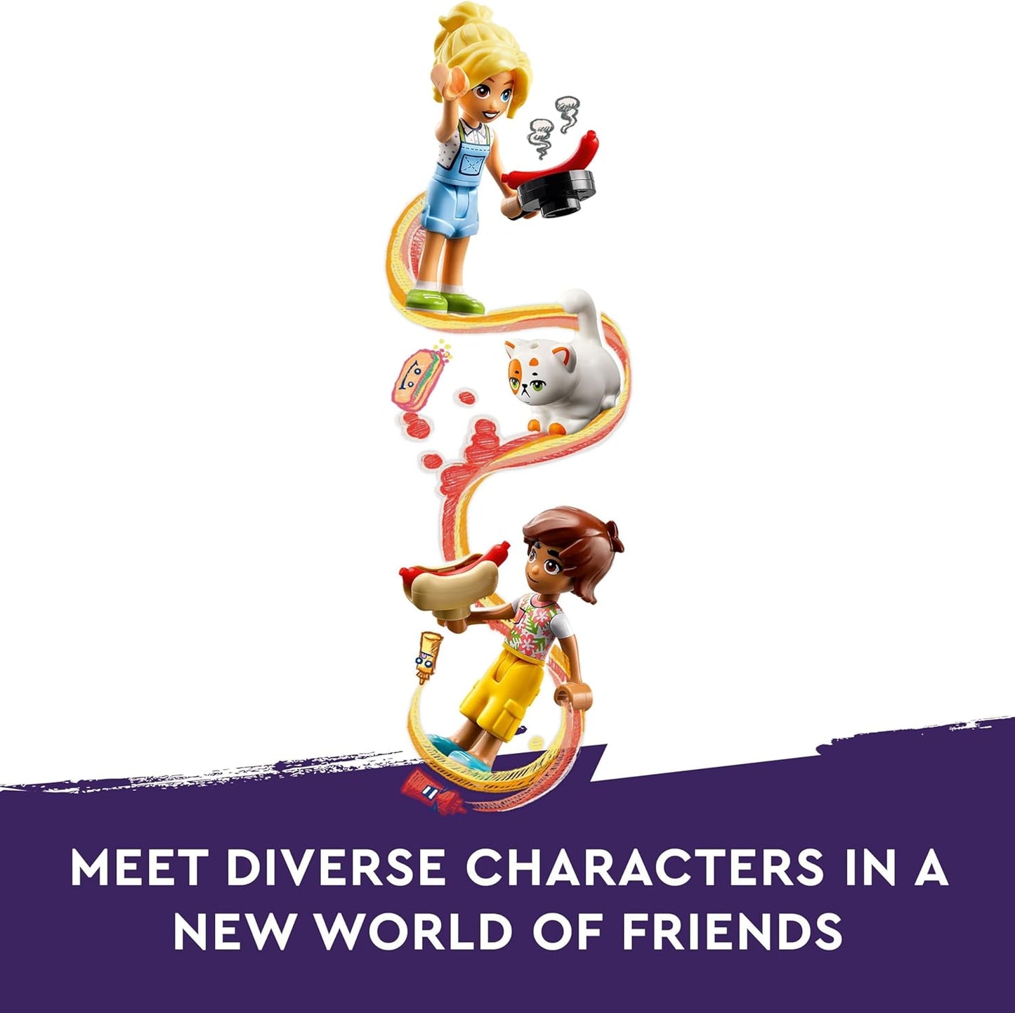 LEGO Brinquedo de caminhão de comida de cachorro-quente Friends para meninas, meninos e crianças de 4 anos ou mais, conjunto de veículos com personagens de miniboneca, figura de gato e acessórios de cozinha, brincadeira de fingir