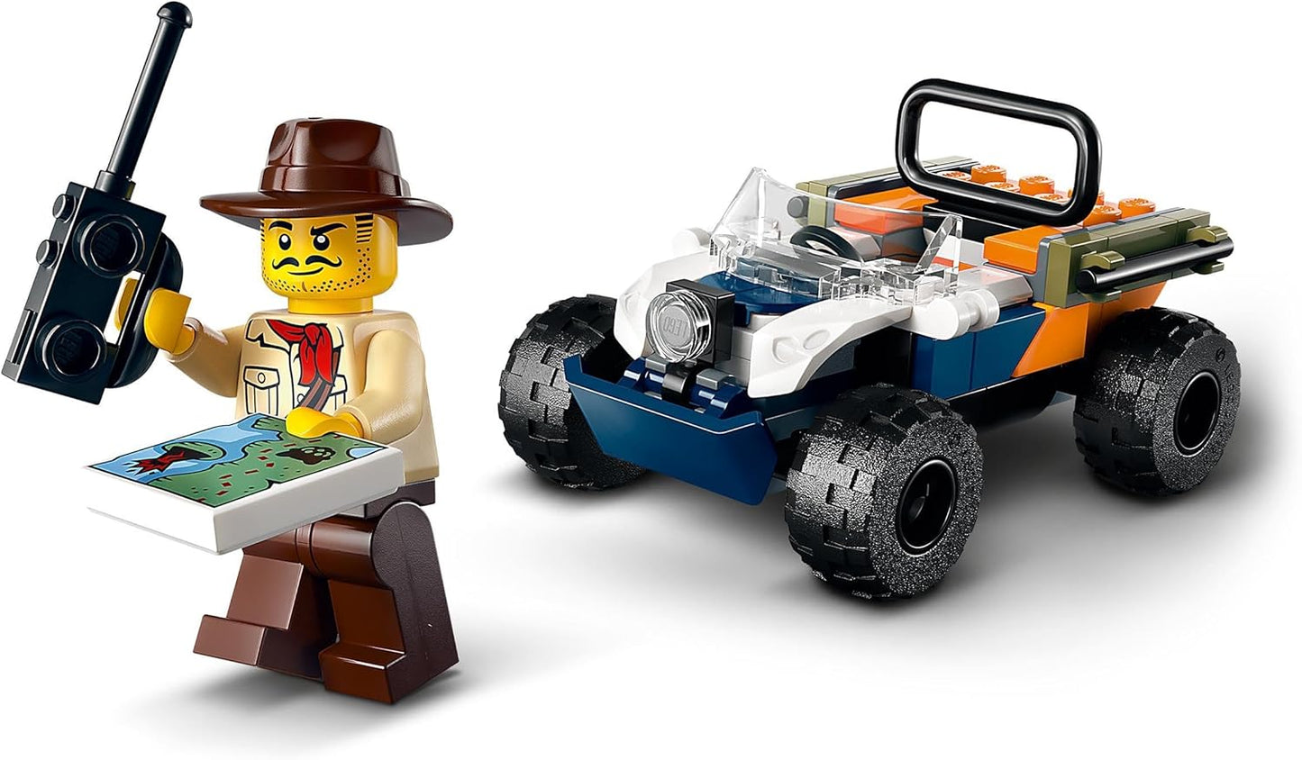 - O que está na caixa? - Este conjunto LEGO City inclui tudo o que as crianças precisam para construir um ATV LEGO, cenário de selva, minifigura de explorador e figura de brinquedo de panda vermelho