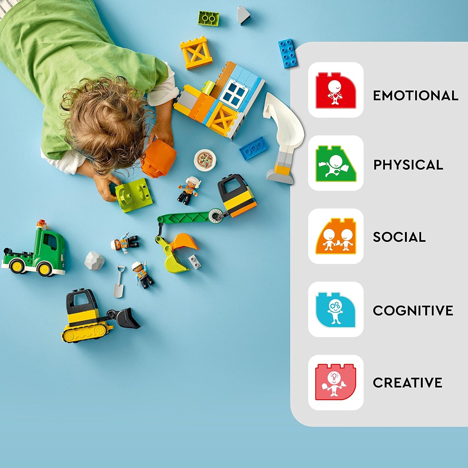 - Este brinquedo educativo LEGO DUPLO Construction Site para crianças apresenta um brinquedo escavadeira, guindaste, betoneira e 3 figuras e oferece horas de diversão