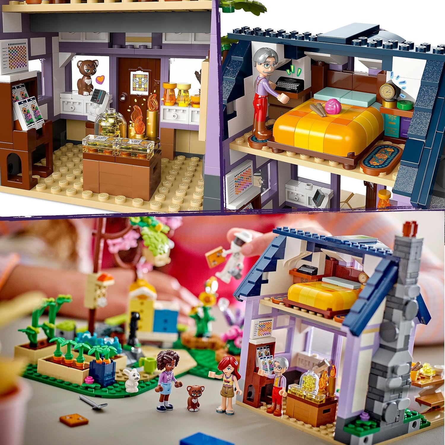 - Personagens LEGO Friends – Inclui 4 mini bonecos: Paisley, Aliya, avós Orla e Terence, além de figuras de brinquedo de animais do coelho Amos e Peri, o gato