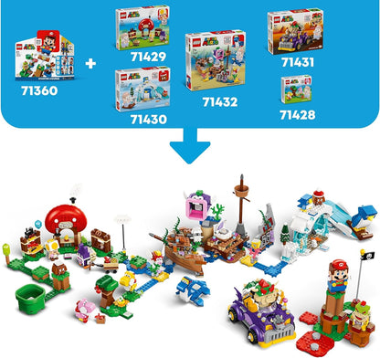 - Para o jogo interativo, é necessário um dos conjuntos do Starter Course, contendo a figura LEGO Mario (71360), LEGO Luigi (71387) ou LEGO Peach (71403)