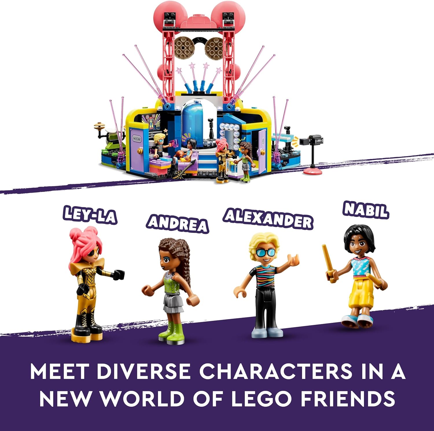 LEGO Conjunto de show de talentos musicais Friends Heartlake City, brinquedos musicais para meninas, meninos e crianças com mais de 7 anos, com instrumentos de guitarra e teclado, 4 personagens Inc. Andrea, presente de brinquedo de construção