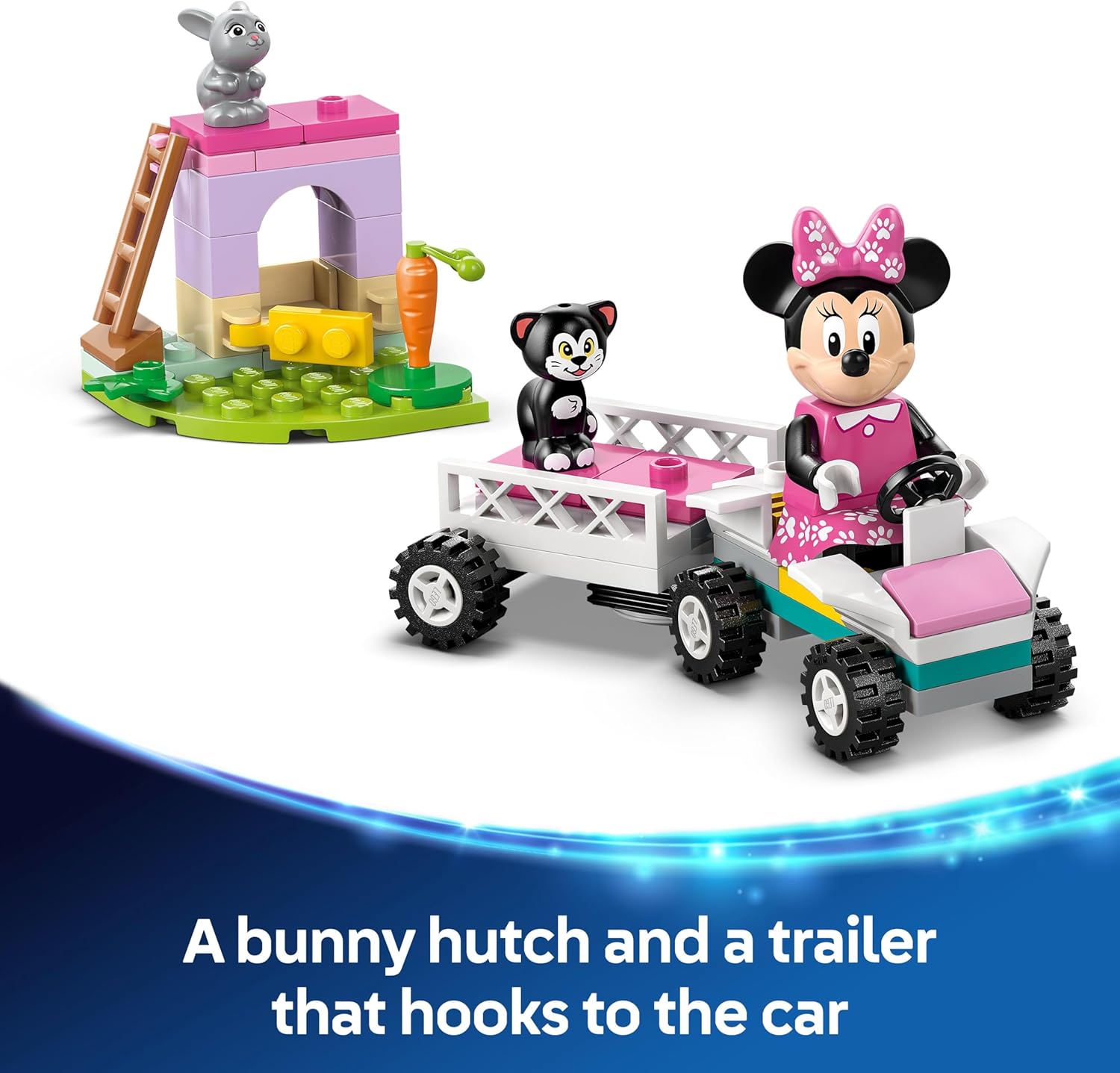 - Na caixa: Um hotel modular para animais de estimação com escorregador, cozinha de brinquedo e casinha de coelho, além de um carro, trailer, 2 mini bonecas LEGO│Disney (Minnie Mouse e Margarida) e 3 figuras de animais de estimação da Disney.