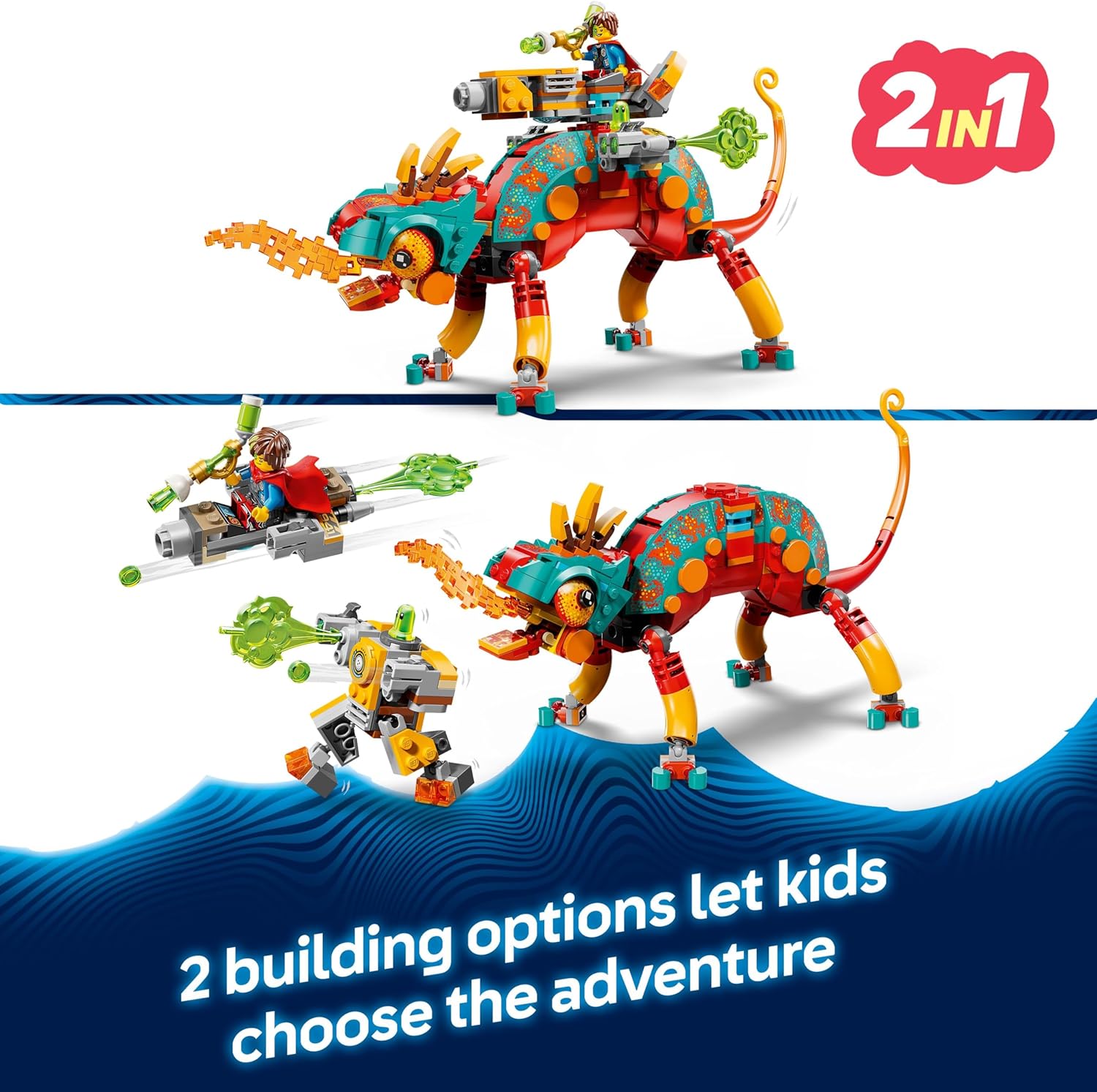 - Brinquedo animal reconstruível – O camaleão articulável tem boca, cabeça, cauda, olhos e pernas que se movem e pode ser construído como um guardião do fogo com torre de blaster e atiradores ou como um jato e um mini robô.