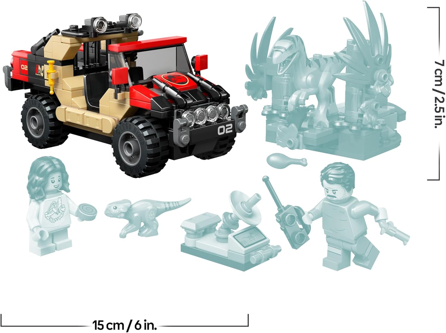 - Conjunto de construção de dinossauro e carro – Inclui figuras moldadas de dinossauro LEGO de um filhote de Aquilops e um Velociraptor, além de um veículo off-road e duas minifiguras LEGO, Reuben e Isabella, para brincadeiras de ação.