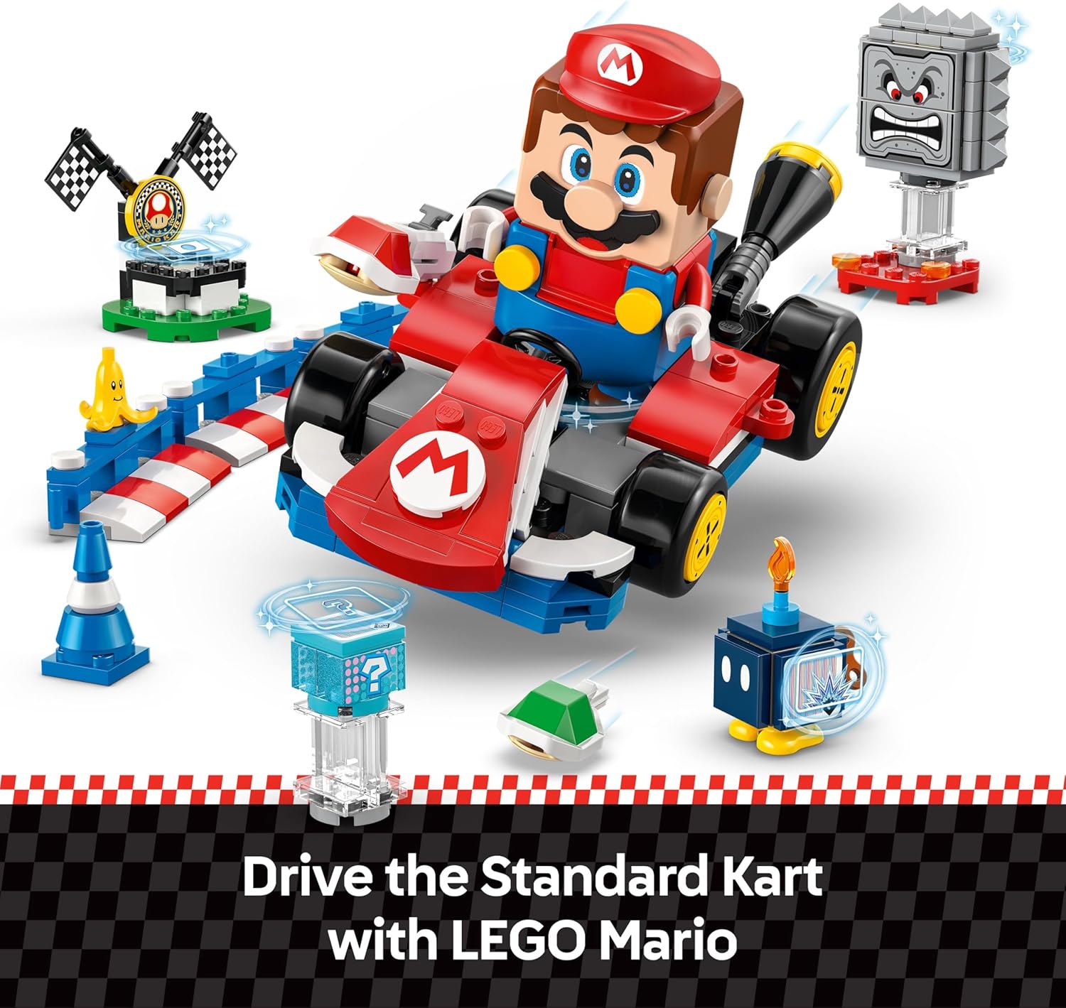 - Brinquedo interativo – Corra com o Kart Padrão com o LEGO Mario, ganhe recompensas digitais na Caixa de Itens, derrote o Bob-omb e o Thwomp, veja como o LEGO Mario reage às placas LEGO verdes e vermelhas e muito mais.