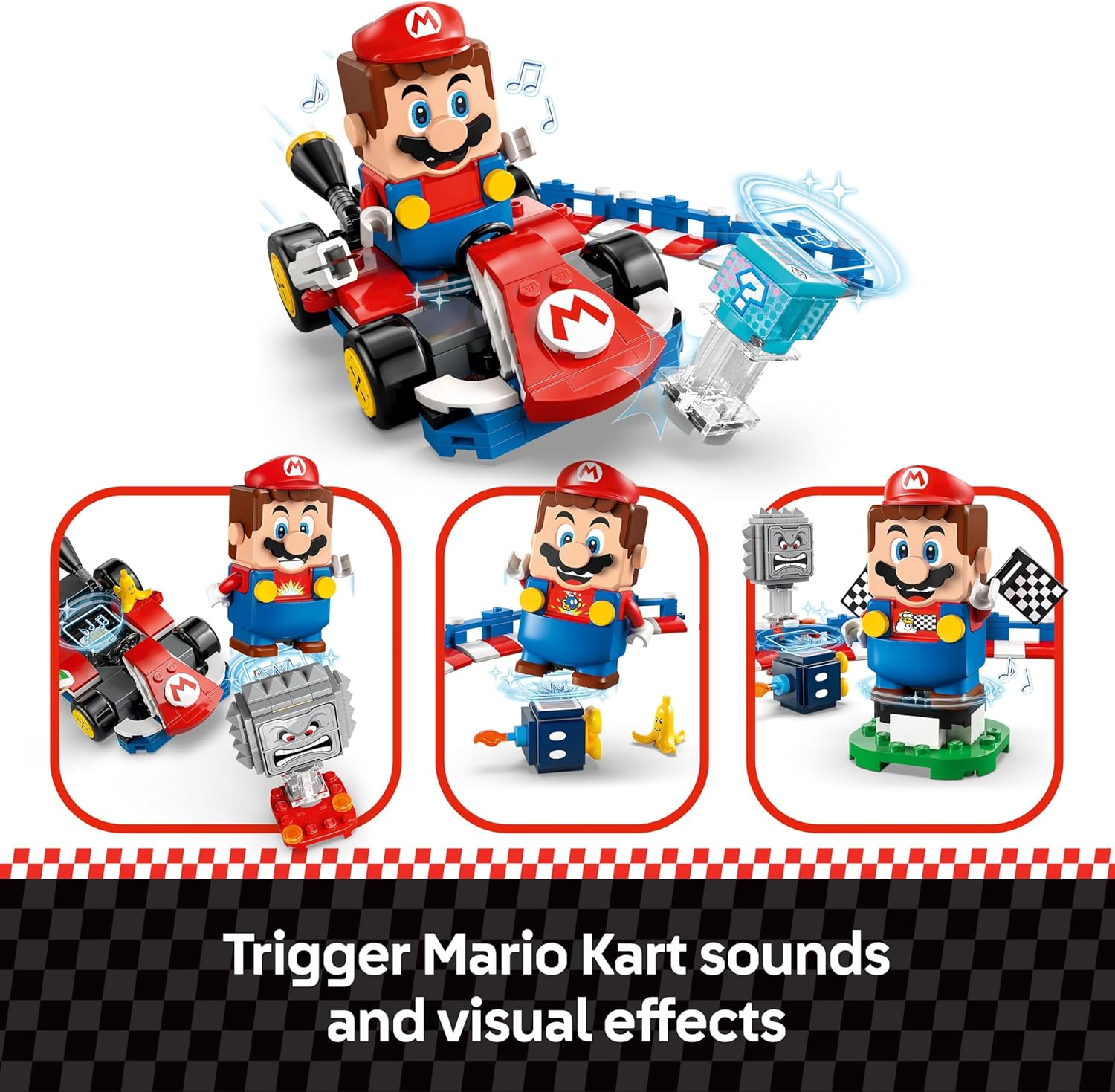 - Construa e corra – Um Kart Padrão de brinquedo, com ação de derrapagem e função de lançamento de casco, uma Caixa de Itens, 3 barreiras de pista conectáveis, 2 cones de trânsito e área de largada e círculo dos vencedores com Etiquetas de Ação.