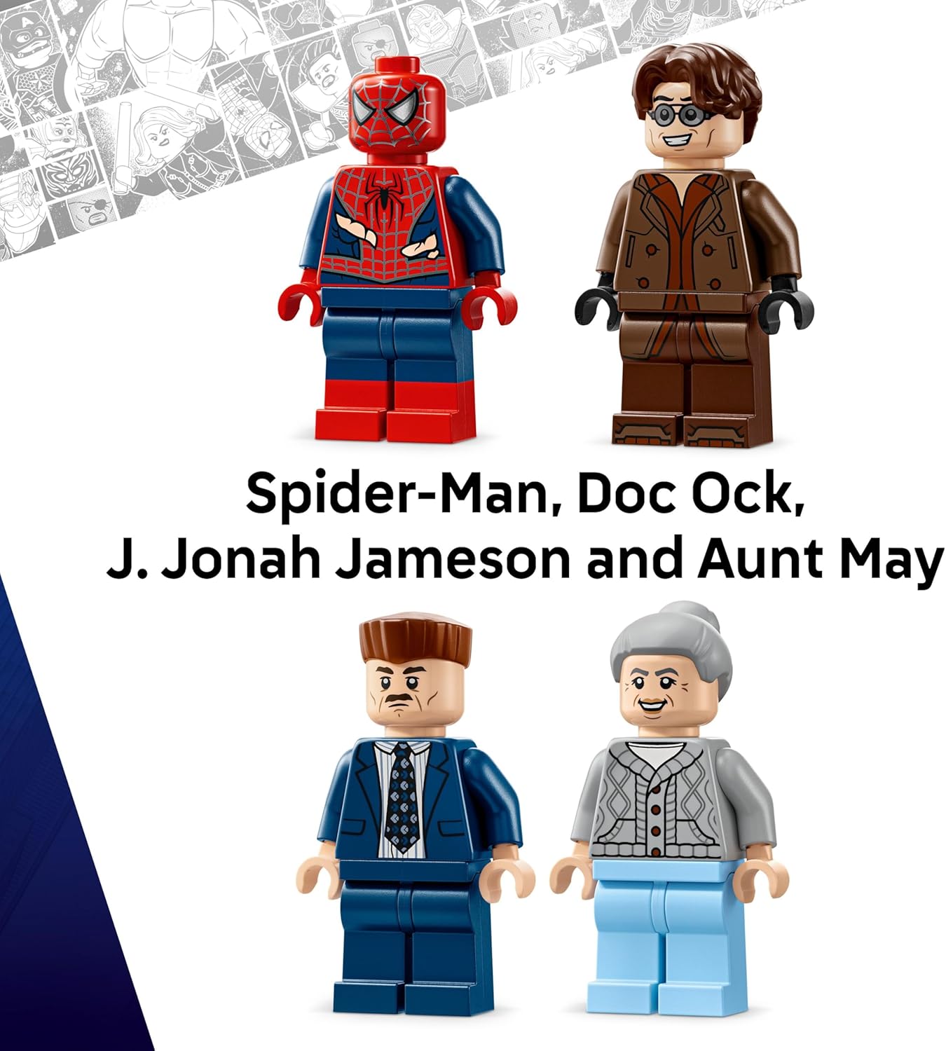- Minifiguras LEGO Marvel – O conjunto inclui minifiguras do filme Homem-Aranha 2 da Marvel Studios: Homem-Aranha, Doutor Octopus, J. Jonah Jameson e Tia May.