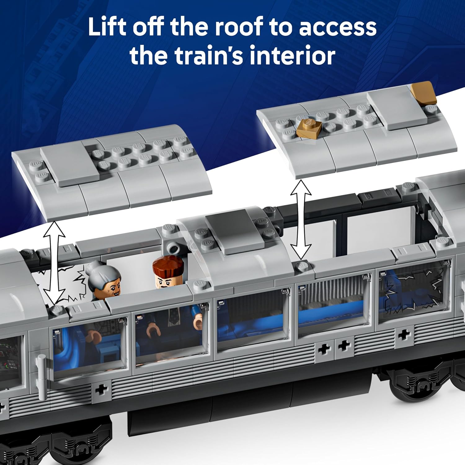 - Colecionáveis LEGO Marvel – A minifigura do Homem-Aranha vem com cabeças com e sem máscara, e o teto removível do trem dá acesso a um interior com espaço para um passageiro se sentar.