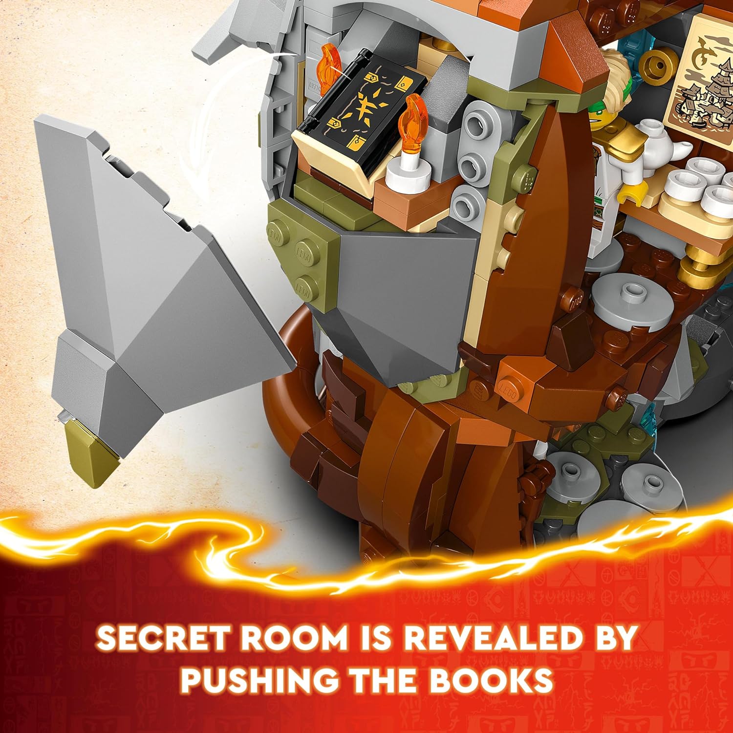 - Brinquedo Ninja repleto de recursos – Vem com um dragão de pedra, cachoeira, cerejeira, biblioteca com pergaminhos, livros, um jogo de chá e uma sala secreta