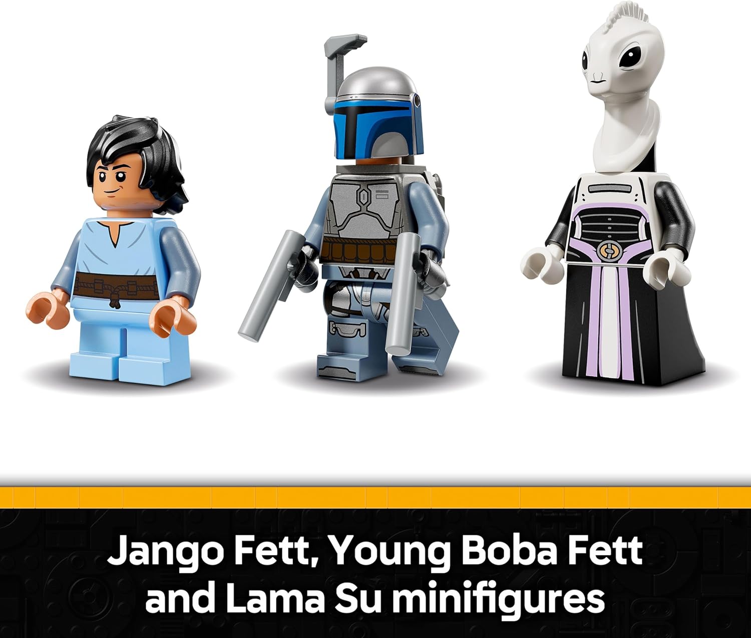 - 3 minifiguras LEGO Star Wars – O conjunto de construção inclui Jango Fett com 2 pistolas blaster e um jetpack, Boba Fett jovem e Lama Su, para as crianças interpretarem aventuras divertidas.