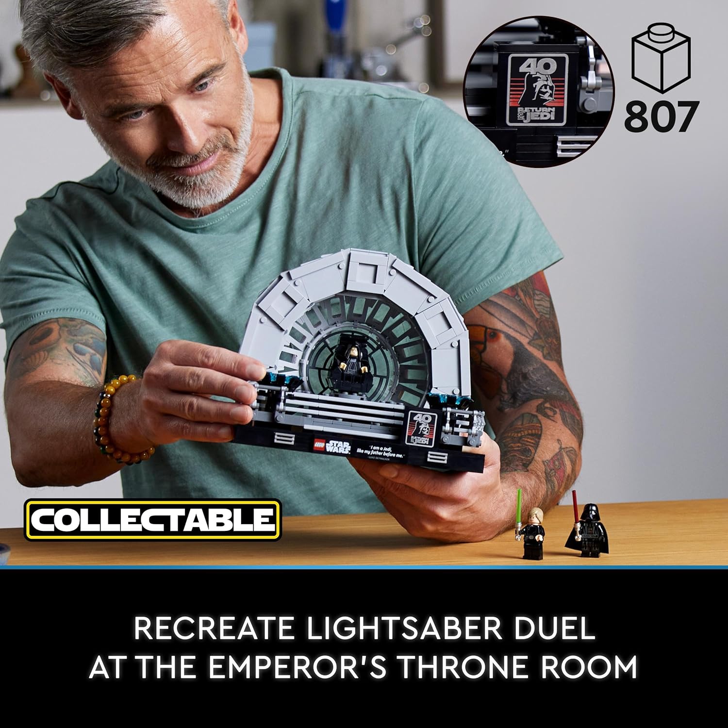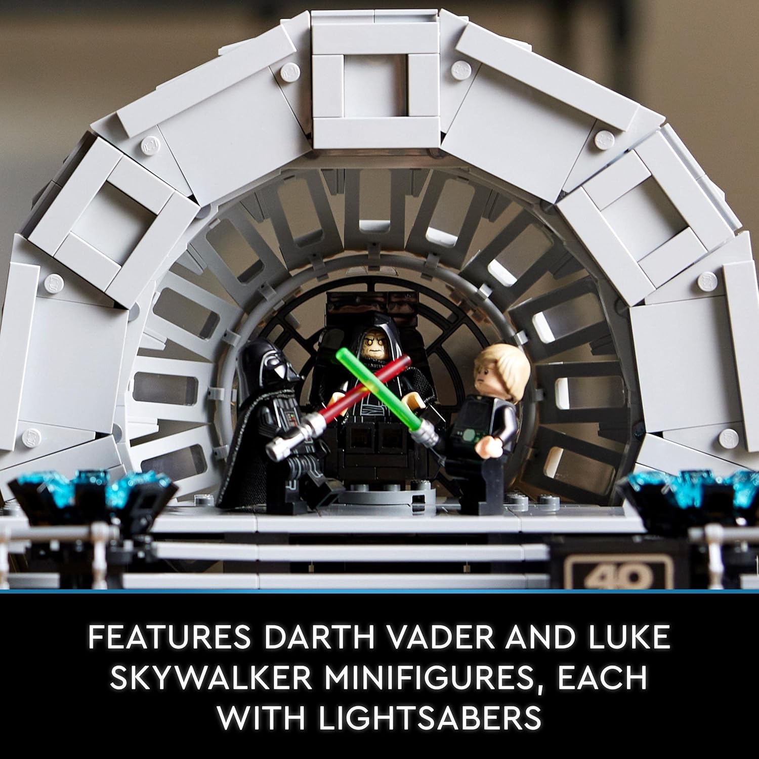- Reviva o duelo de sabres de luz entre Darth Vader e Luke Skywalker de Star Wars: O Retorno dos Jedi com este conjunto adulto LEGO Star Wars Diorama