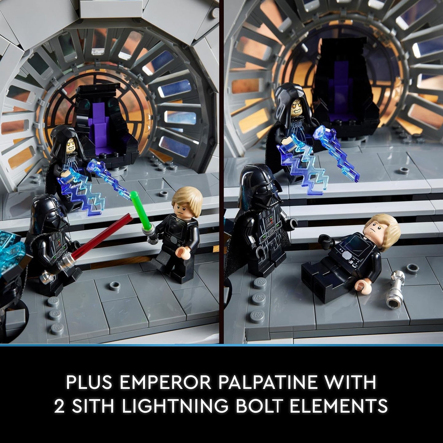 - Inclui minifiguras LEGO Star Wars: Darth Vader e Luke Skywalker com sabres de luz e Imperador Palpatine com 2 elementos relâmpago Sith