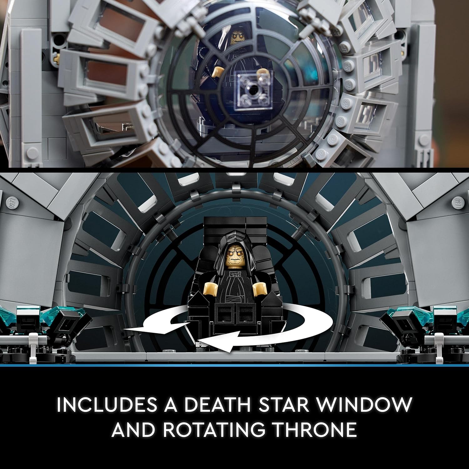 - Construa a sala do trono do Imperador com um elemento de janela circular da Estrela da Morte projetado especialmente para este conjunto, um trono giratório e 2 consoles de exibição