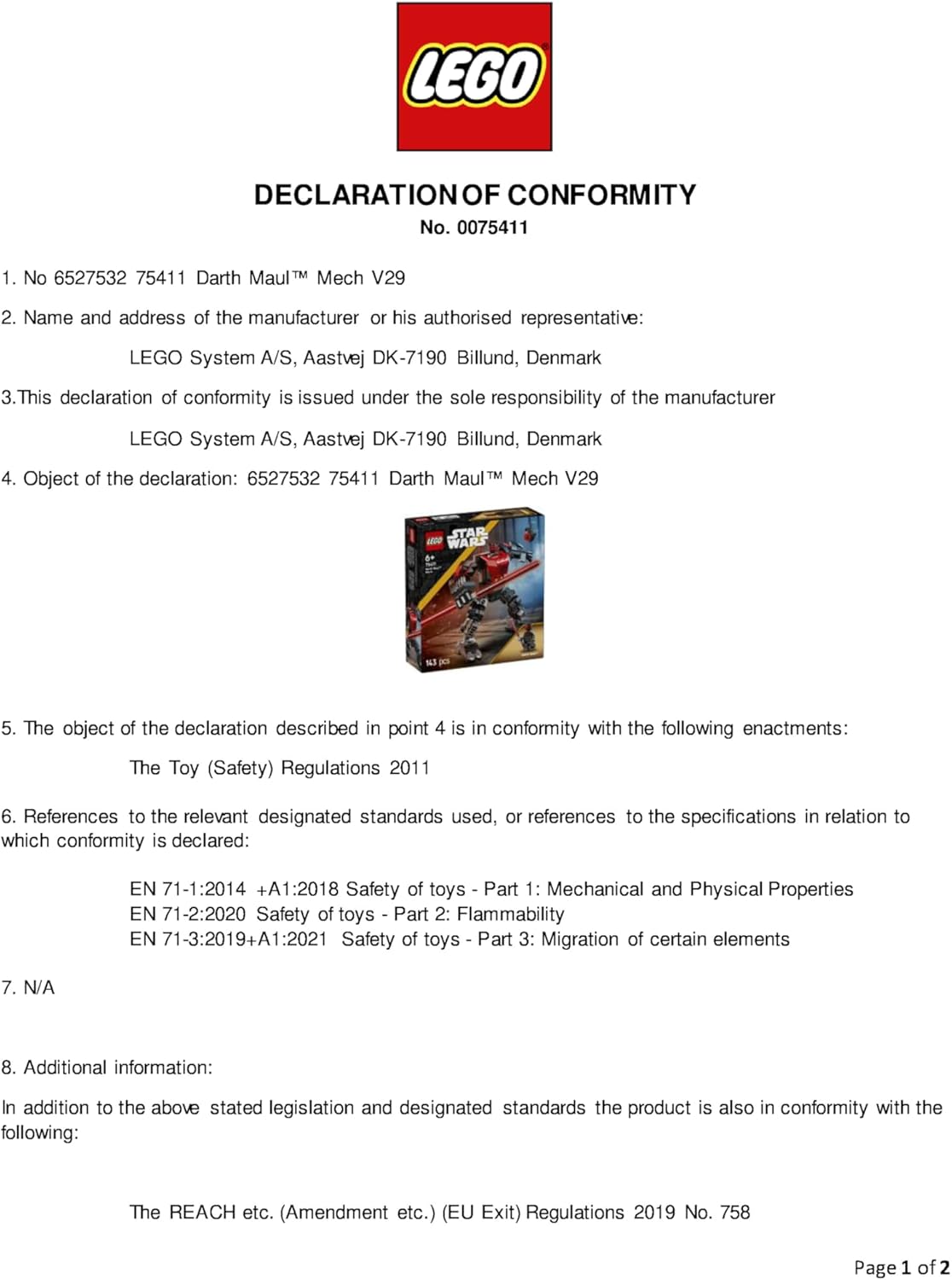 - Traje de robô LEGO montável – O robô tem mãos, braços, pernas e pés articulados, um cockpit de minifigura LEGO que abre, além de um grande sabre de luz vermelho de lâmina dupla.