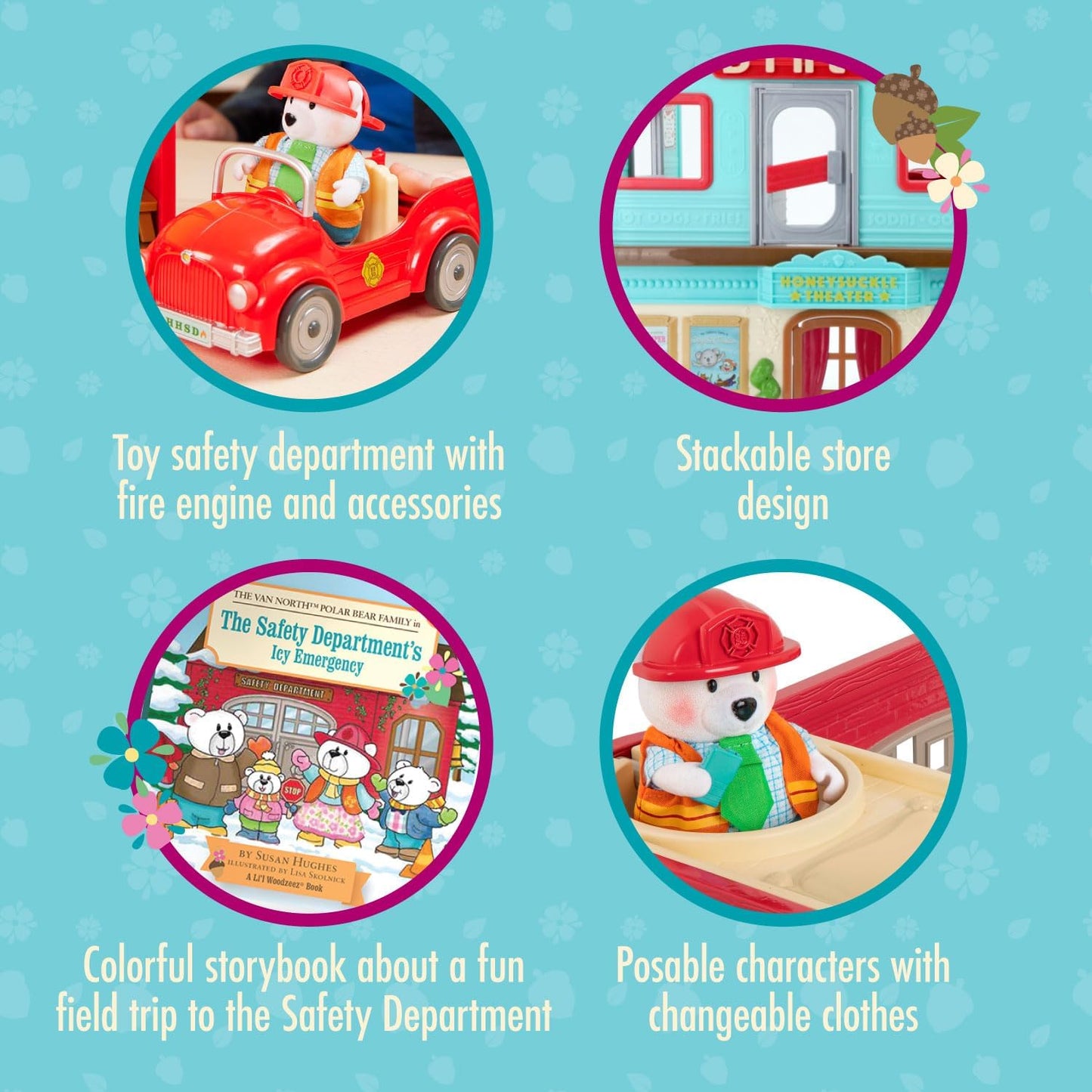 Li'l Woodzeez WZ6828SZ Li’l Woodzeez – Quartel de bombeiros de brinquedo – Conjunto de estatuetas de animais – Caminhão e acessórios – Livro de histórias incluído – 3 anos + – Honeysuckle Hollow Safety Department-Deluxe, Multi