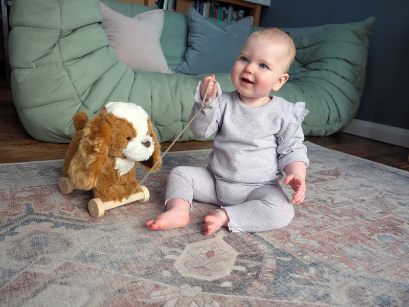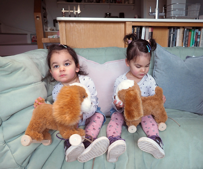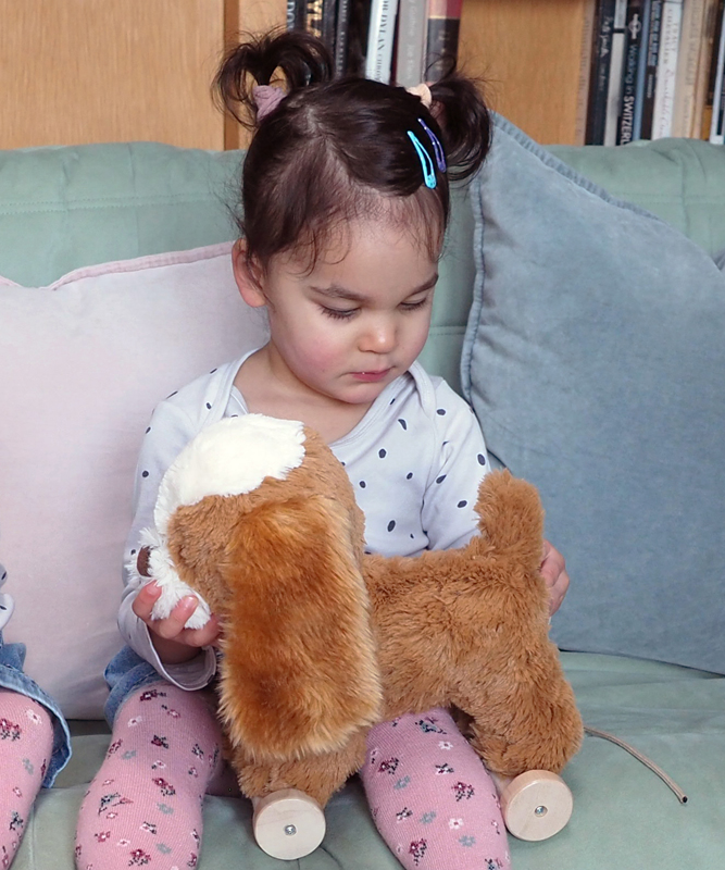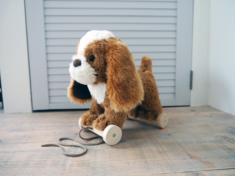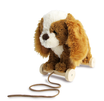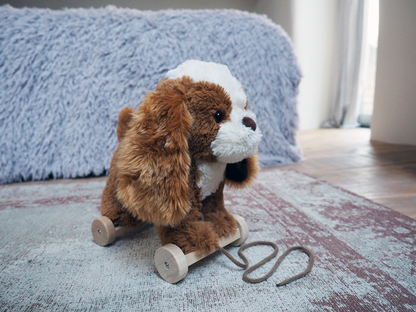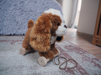 Com rodas de madeira removíveis, o Peanut Dog é um brinquedo para puxar e um amigo para abraçar.