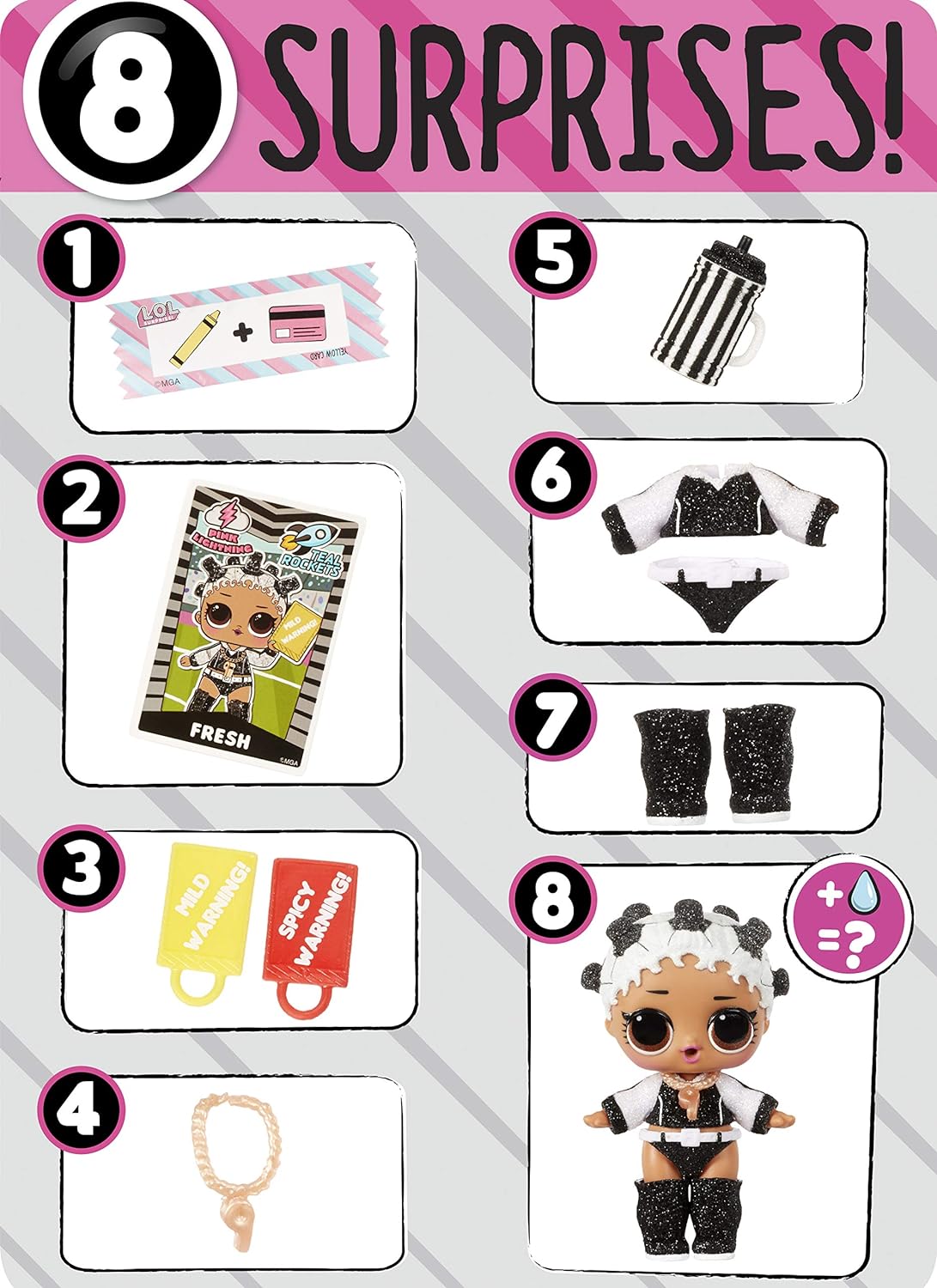 - 7 SURPRESAS PARA UNBOX: (1) 1 L.O.L. Surpresa! Boneca All Star Sports Moves - Cheer; (2) Moda; (3) Sapatos; (4) Garrafa; (5) Acessório; (6) Função Mover; (7) Cartão de troca