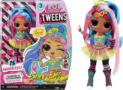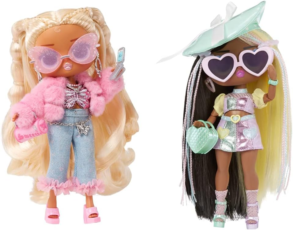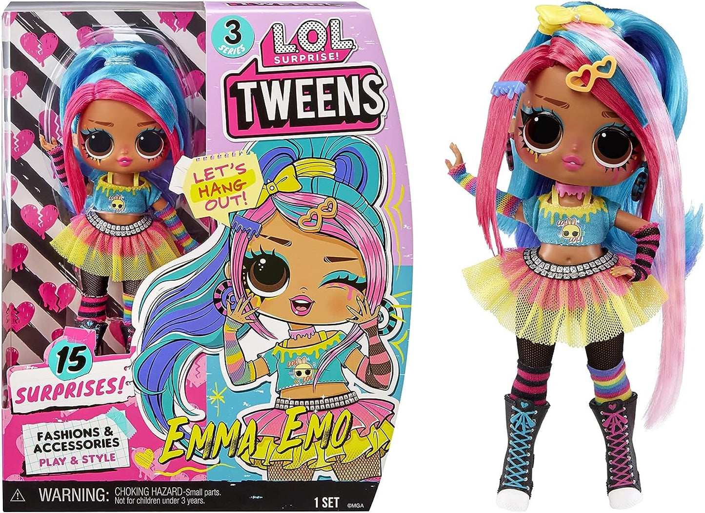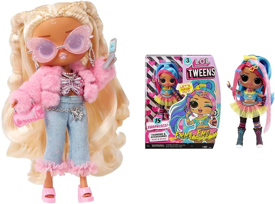 - UNBOX 15 SURPRESAS - Inclui uma boneca fashion Tweens de 6,5 polegadas/16,5 cm, roupas ferozes, sapatos, acessórios, óculos de sol, brincos, um colar, uma bolsa com pingente de borboleta, um cinto de corrente, uma bolsa, um telefone flip, uma escova de cabelo e um carrinho de boneca