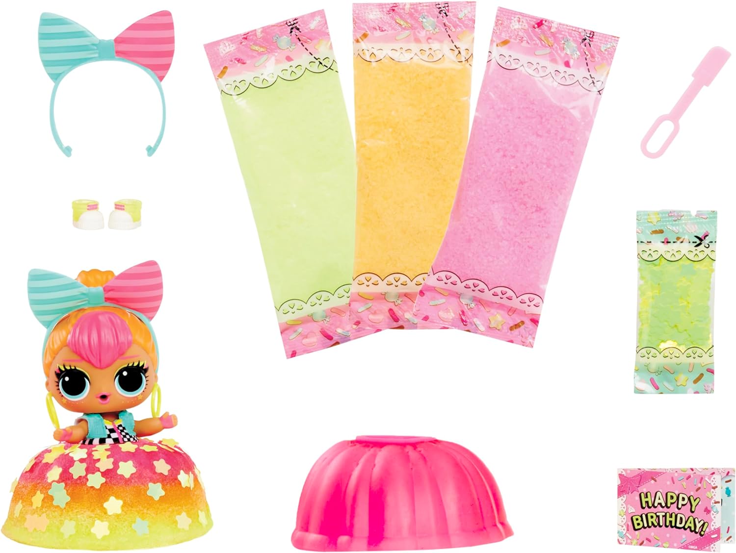 - INCLUI: LOL Surprise Mix & Make Birthday Cake Tot inclui 3 ingredientes coloridos, molde de bolo, moda, acessórios, espátula e granulados de glitter para decoração