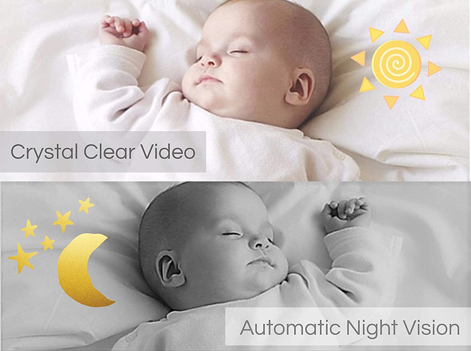 ASSIM QUE SEU BEBÉ PRECISAR DE VOCÊ, você poderá ouvi-los e vê-los claramente com o grande visor LCD colorido e transmissão de vídeo digital de alta resolução. A câmera não possui posicionamento remoto, mas pode ser inclinada manualmente em 60° ou girada em 360° para uma visão perfeita. O INFRARED NIGHT VISION liga automaticamente com pouca luz, permitindo que você fique de olho no bebê durante a noite.