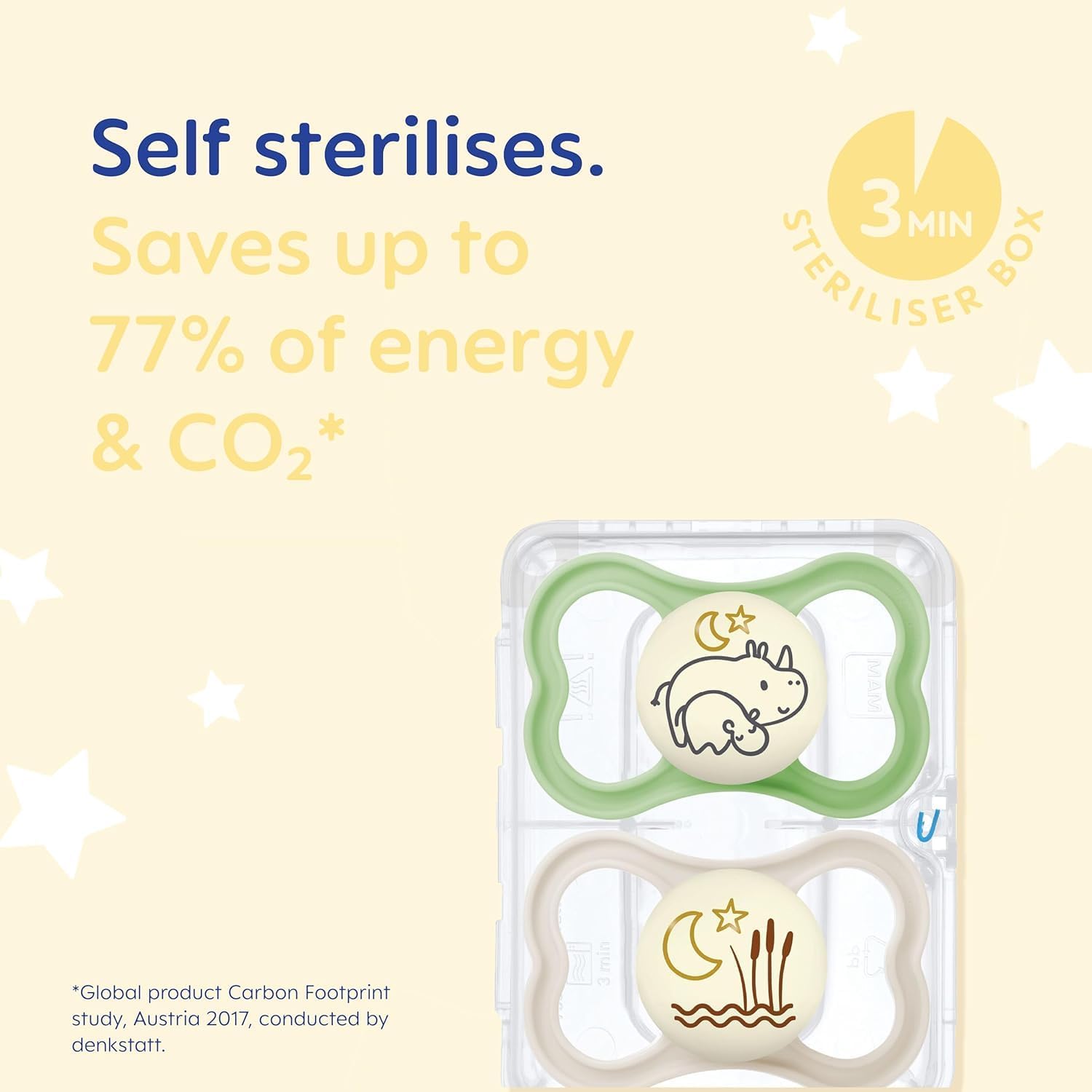 - Estojo de viagem: Funcionando como um esterilizador de chupeta para bebês, seu Estojo de Viagem MAM pode ser esterilizado no micro-ondas em apenas três minutos, tornando-o ideal para onde você estiver.