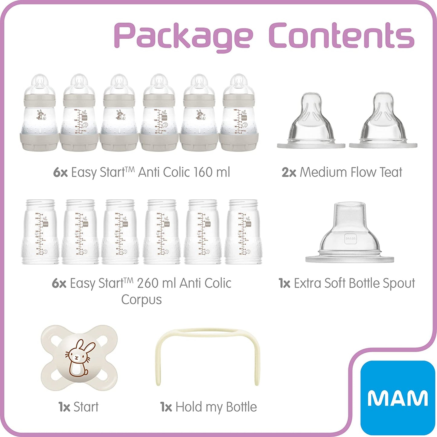 O conjunto EASY START auto-esterilizante MAM é uma solução completa para alimentar bebês desde o nascimento até o seu primeiro aniversário, contendo tudo que você precisa para dar ao seu bebê uma ótima experiência de alimentação em casa ou durante o passeio.