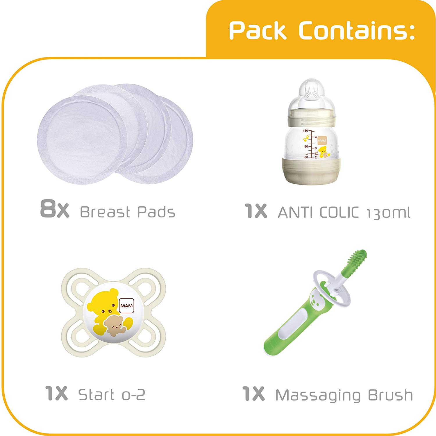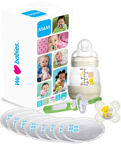 Detalhes do produto: Caixa para recém-nascidos MAM, cheia de presentes para bebês recém-nascidos gratuitos de BPA, incluindo mamadeira MAM, chupeta para bebês, escova de massagem para dentição e almofadas para seios