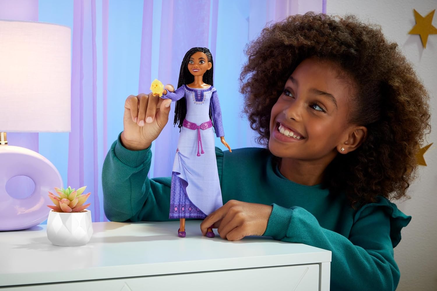 - Com a boneca da moda Singing Asha de Rosas do filme da Disney Wish com a música de sua canção, as crianças podem vivenciar a diversão musical do filme repetidas vezes.