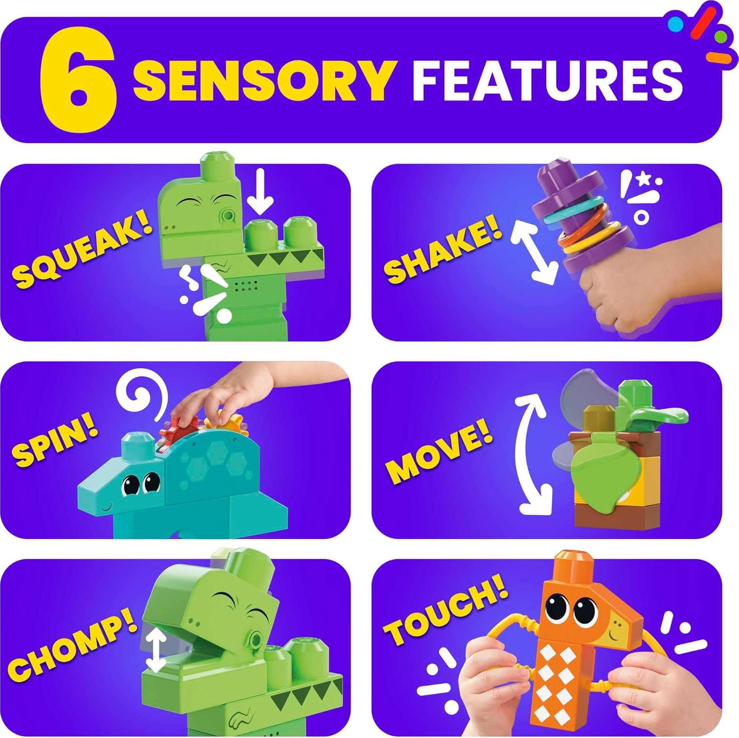 MEGA BLOKS Fisher-Price Brinquedo de construção sensorial, Squeak n Chomp Dinos com 24 peças, T-Rex, ideias de presentes de blocos para crianças de 1 ano ou mais, HKN43