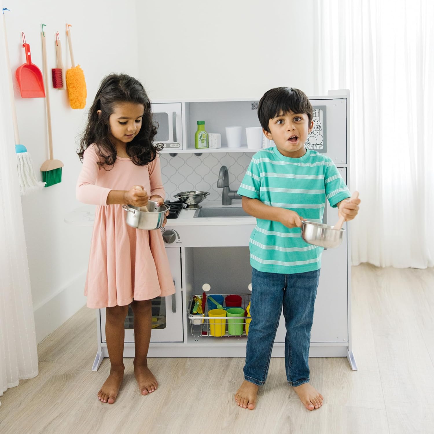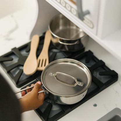 - CONJUNTO DE COZINHA KIDS PARA FINGIR CONJUNTOS DE COMIDA PARA CRIANÇAS COZINHA - O conjunto de cozinha Melissa e Doug para crianças é um conjunto de cozinha infantil de aço inoxidável polido à mão de 8 peças com acessórios de cozinha de madeira, incluindo uma peneira, uma panela com tampa, 2 panelas , 2 utensílios de cozinha infantis de madeira e um rack conveniente para armazenamento.