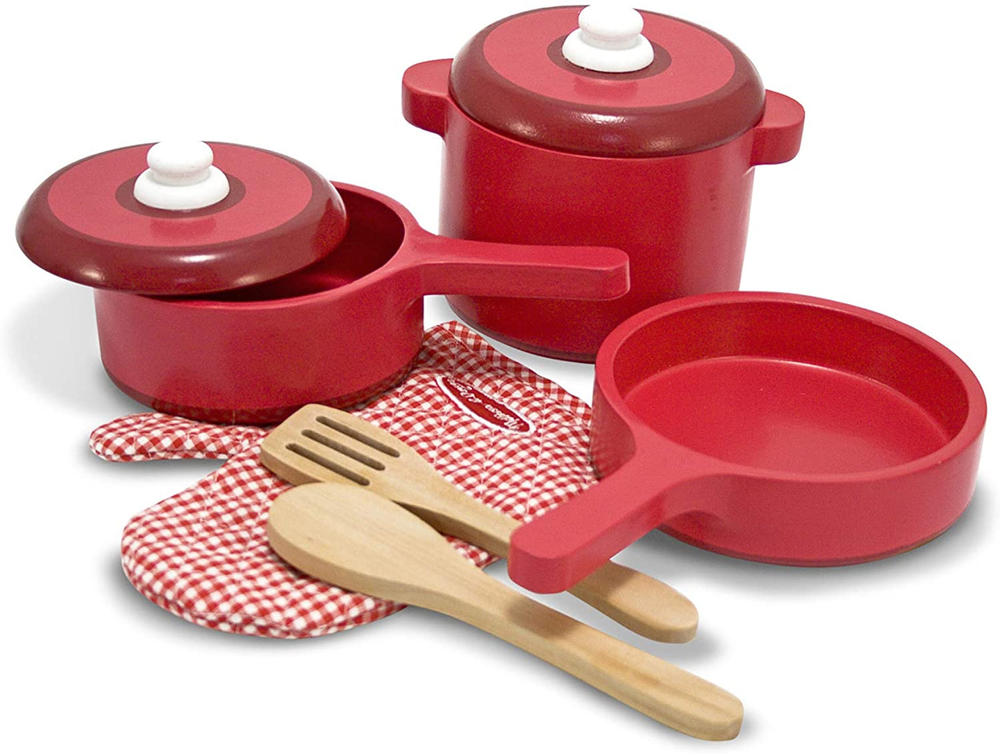 PANELAS DE MADEIRA: O conjunto de acessórios de cozinha de madeira Deluxe Melissa & Doug equipa as crianças para uma experiência emocionante de brincar na cozinha!