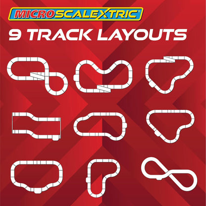 - PLUG & PLAY: A linha Micro Scalextric possui tecnologia Plug & Play, tornando-a rápida e simples de montar e desmontar. Este conjunto requer espaço de armazenamento mínimo e quando montado cobre uma área de 81x120cm, proporcionando um comprimento de pista de 408 cm