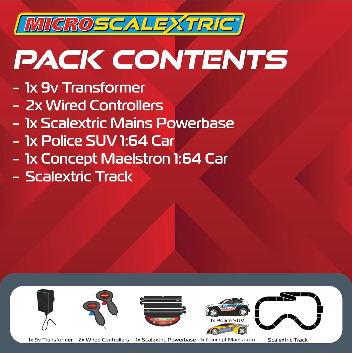 Micro Scalextric - Conjunto de corrida Law Enforcer - Conjuntos de corrida alimentados por rede elétrica, pistas de corrida de slot car para crianças de 4 anos ou mais, inclui 2 carros, 1 conjunto de pista, 1 base de energia elétrica e 2 controladores