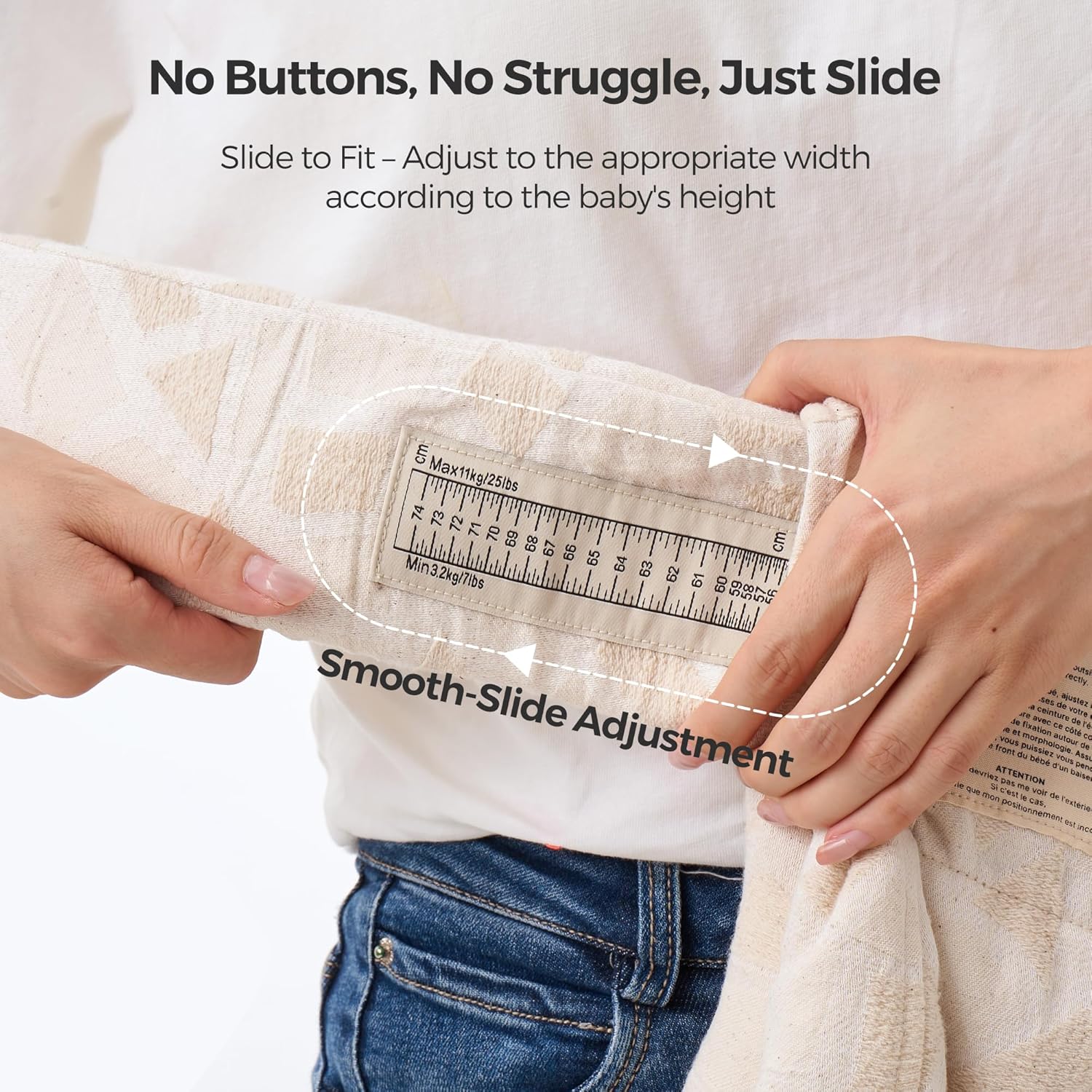 - Ajuste perfeito desde o nascimento: Uma escala visual exclusiva de ajuste dentro do cinto ajuda você a ajustar a largura de acordo com a altura do seu bebê. Consiga um ajuste seguro e a posição natural ergonômica em "M", garantindo o desenvolvimento saudável do quadril e da coluna do bebê com os ajustes adequados para acomodar o tamanho dele.