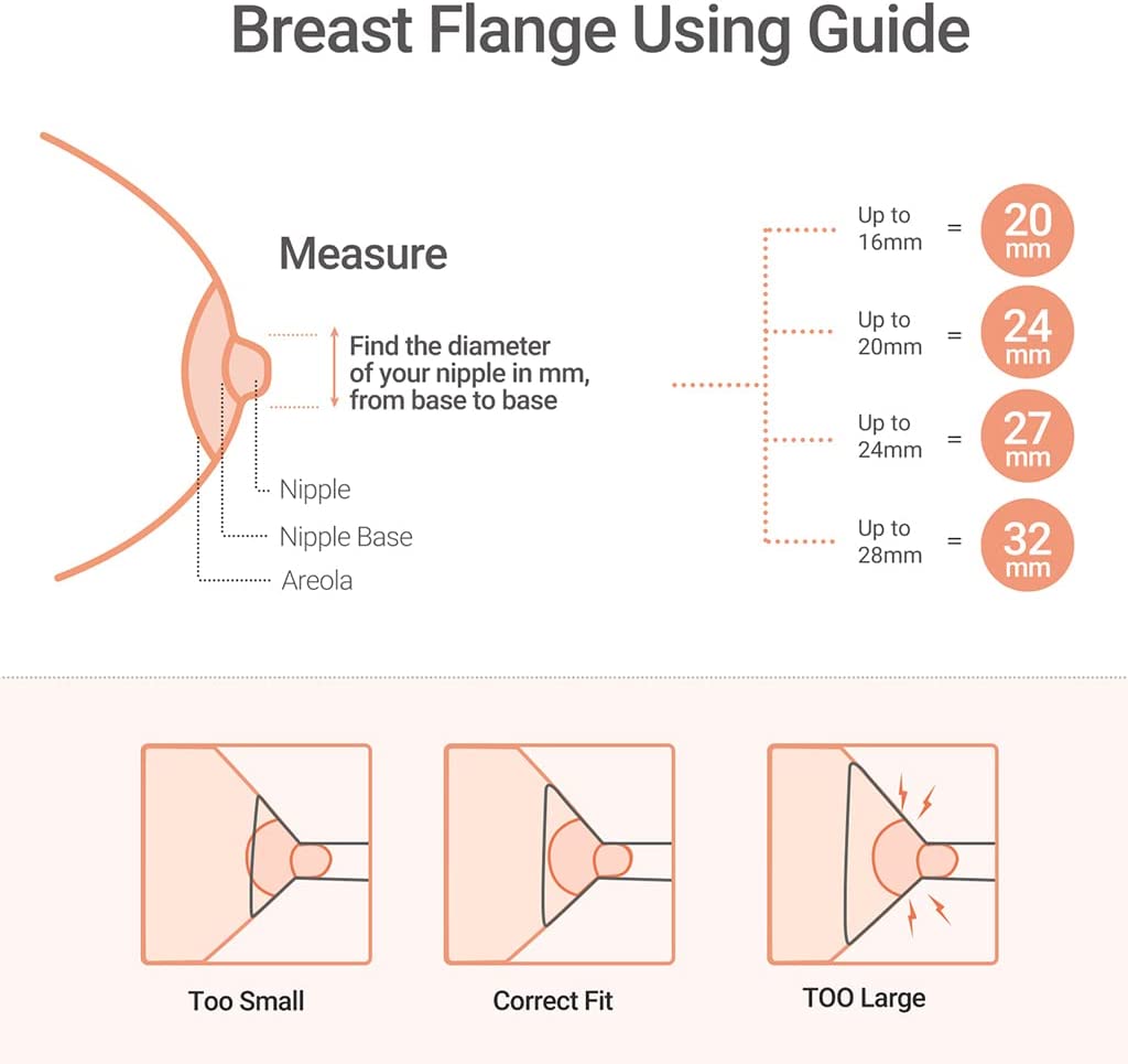 - O tamanho do inserto do flange é importante para o conforto e o bombeamento eficiente. Algumas mães sentirão inchaço nos mamilos durante a extração, por isso é importante observar a aparência dos mamilos durante a extração. Por favor, escolha o inserto de flange de tamanho certo.