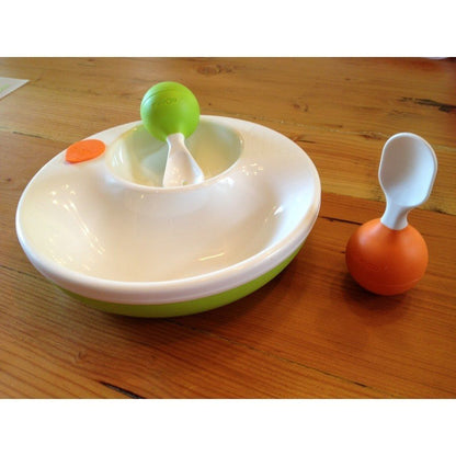 Graças ao movimento de balanço a colher e as pontas dos garfos não entram em contacto com a superfície de mesas ou cadeiras. Muito prático e higiênico - se seu bebê derruba a colher ou garfo no chão eles só vão permanecer na posição vertical! A tampa de proteção atua como um identificador extensível quando o bebê de alimentação e garante a máxima higiene quando em movimento. BPA livre.