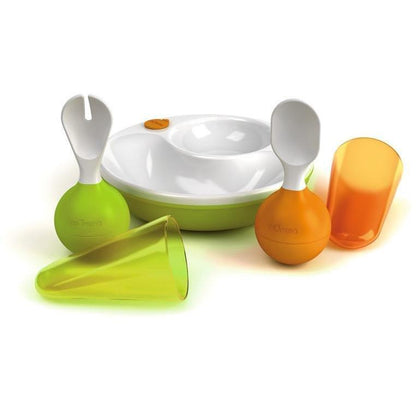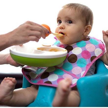 A placa possui compartimentos separados para incentivar o gosto descoberta do bebê, enquanto as bordas arredondadas torna mais fácil para o bebê para pegar comida.