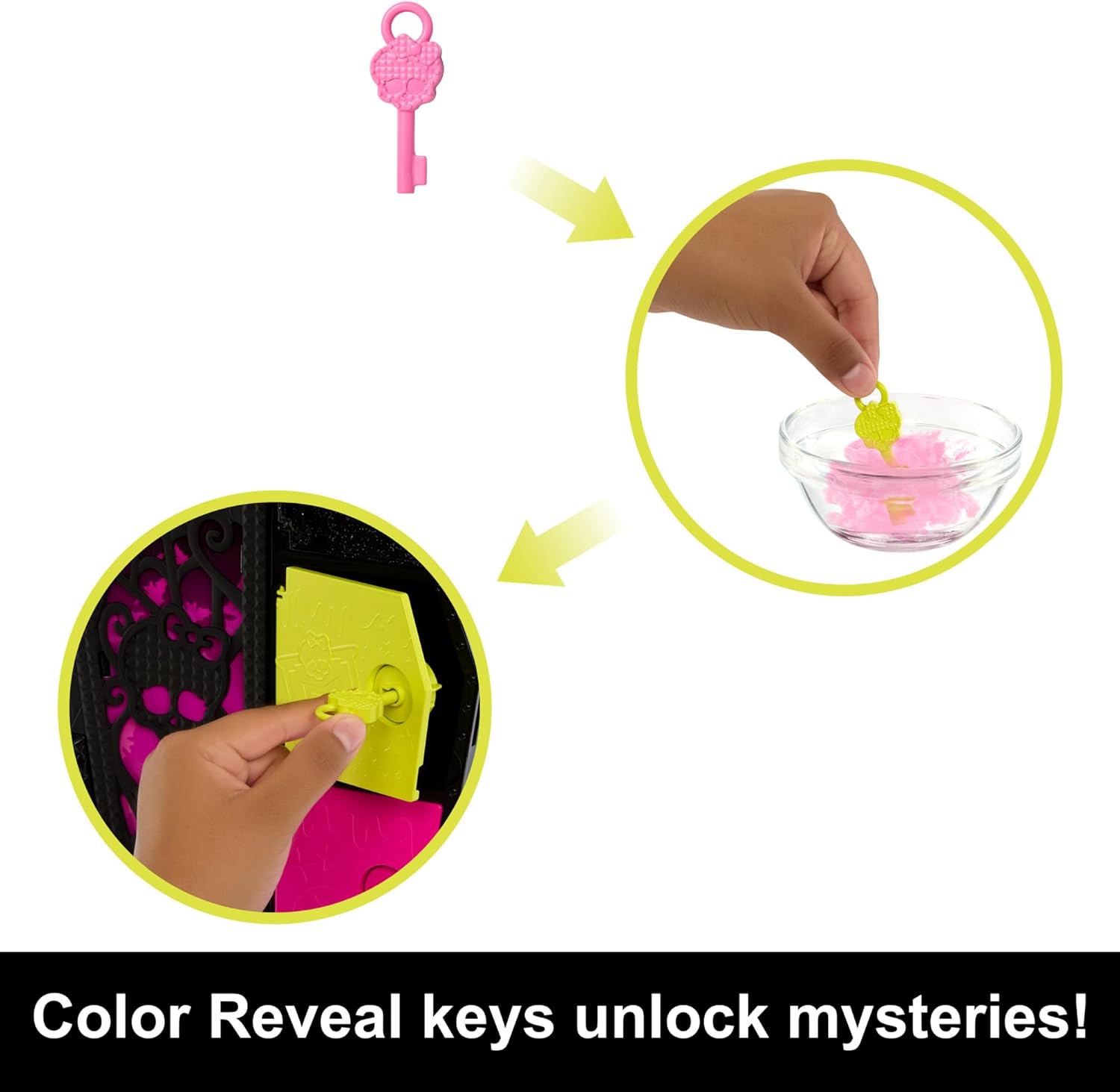 - Você pode esconder um segredo? Pegue as quatro chaves Color Reveal e lave seu revestimento misterioso, depois desbloqueie seus quatro compartimentos correspondentes para encontrar itens escondidos dentro.