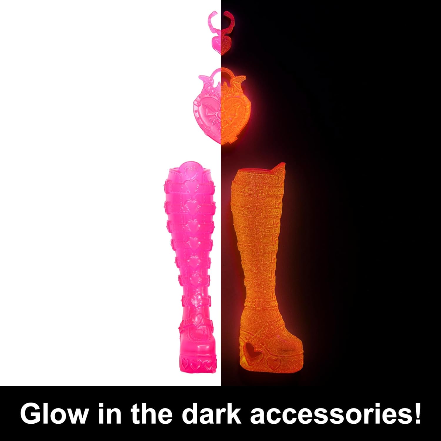 - Apague as luzes para descobrir três acessórios que brilham no escuro! Misture-os e combine-os com as outras peças de estilo incluídas para criar looks que iluminarão até as noites mais escuras.