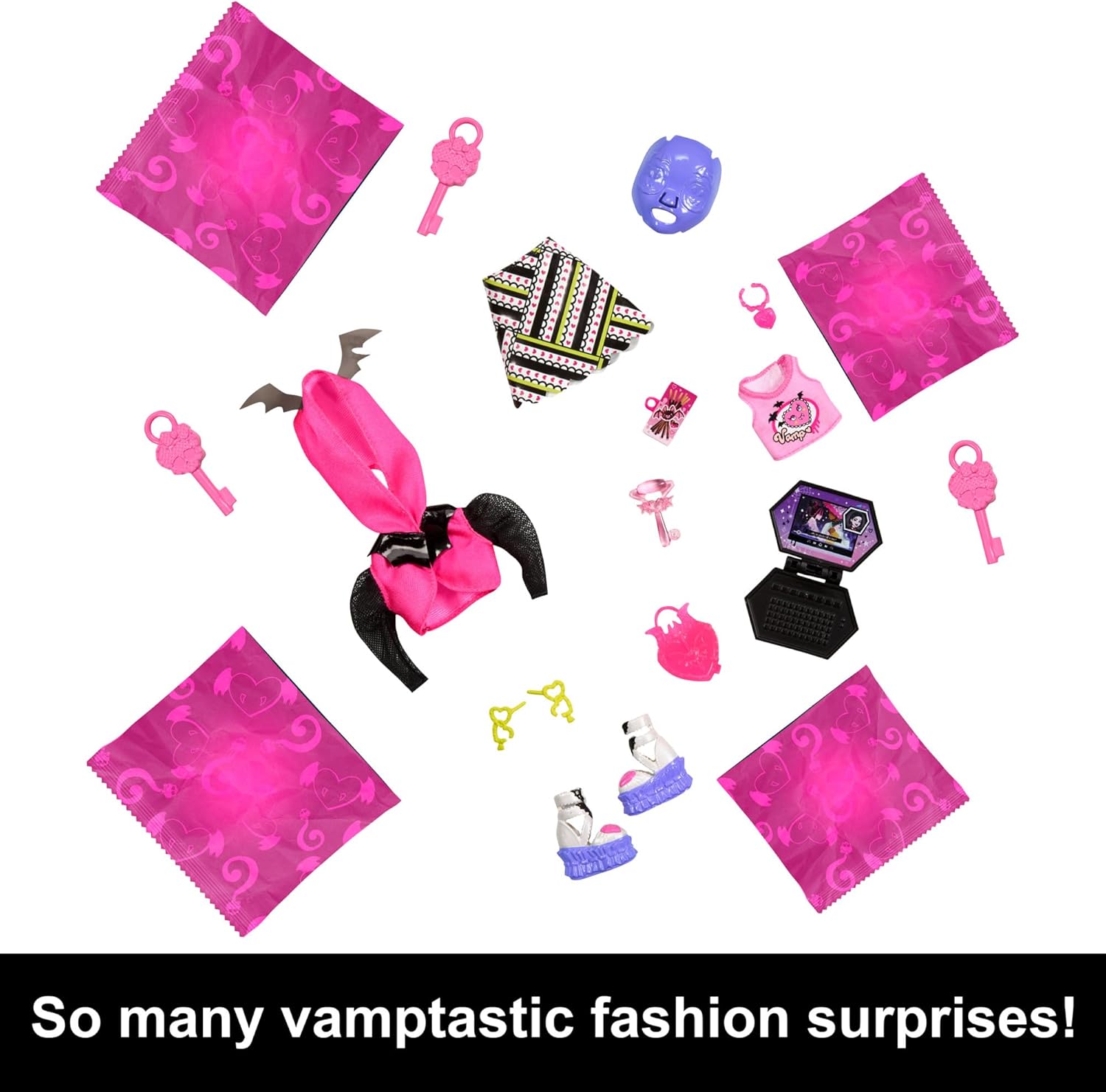 - De um moletom aconchegante e lanche de chocolate a um laptop e máscara facial, Skulltimate Secrets Draculaura vem com mais de 19 surpresas coloridas para despertar a imaginação. Estilize-a com mais de 125 looks!
