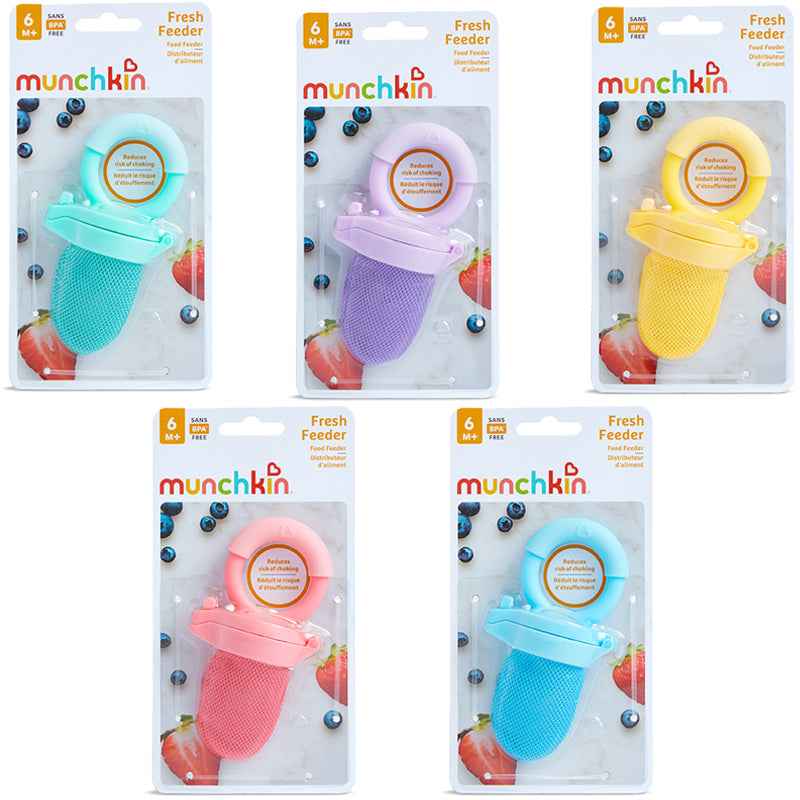 - O alimentador de alimentos frescos Munchkin permite que seu filho desfrute de deliciosos petiscos sem causar preocupação. Com seu design de malha simples, este prático alimentador de dentição permite que os bebês mastiguem e chupem os alimentos com segurança. Basta colocar um pedaço de fruta, vegetal ou até mesmo carne no saco de malha e fechá-lo. O bebê pode mastigar, sugar e saborear toda a comida, deixando passar apenas pedaços pequenos e digeríveis - reduzindo o risco de asfixia. É também uma alternativa inteligente a um brinquedo de dentição. O Alimentador de Alimentos Frescos apresenta uma alça colorida e fácil de segurar para o seu filho segurar - tornando este o primeiro passo real em direção à independência alimentar.