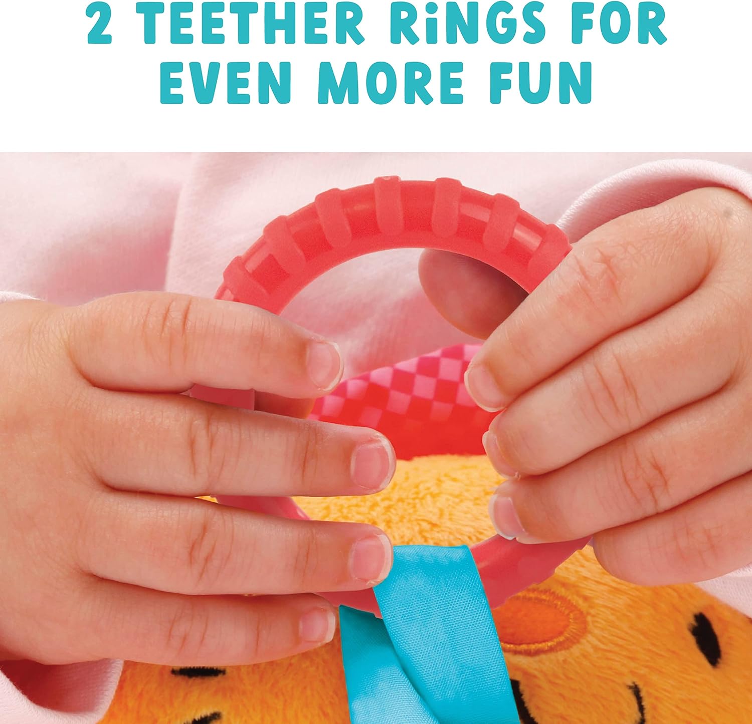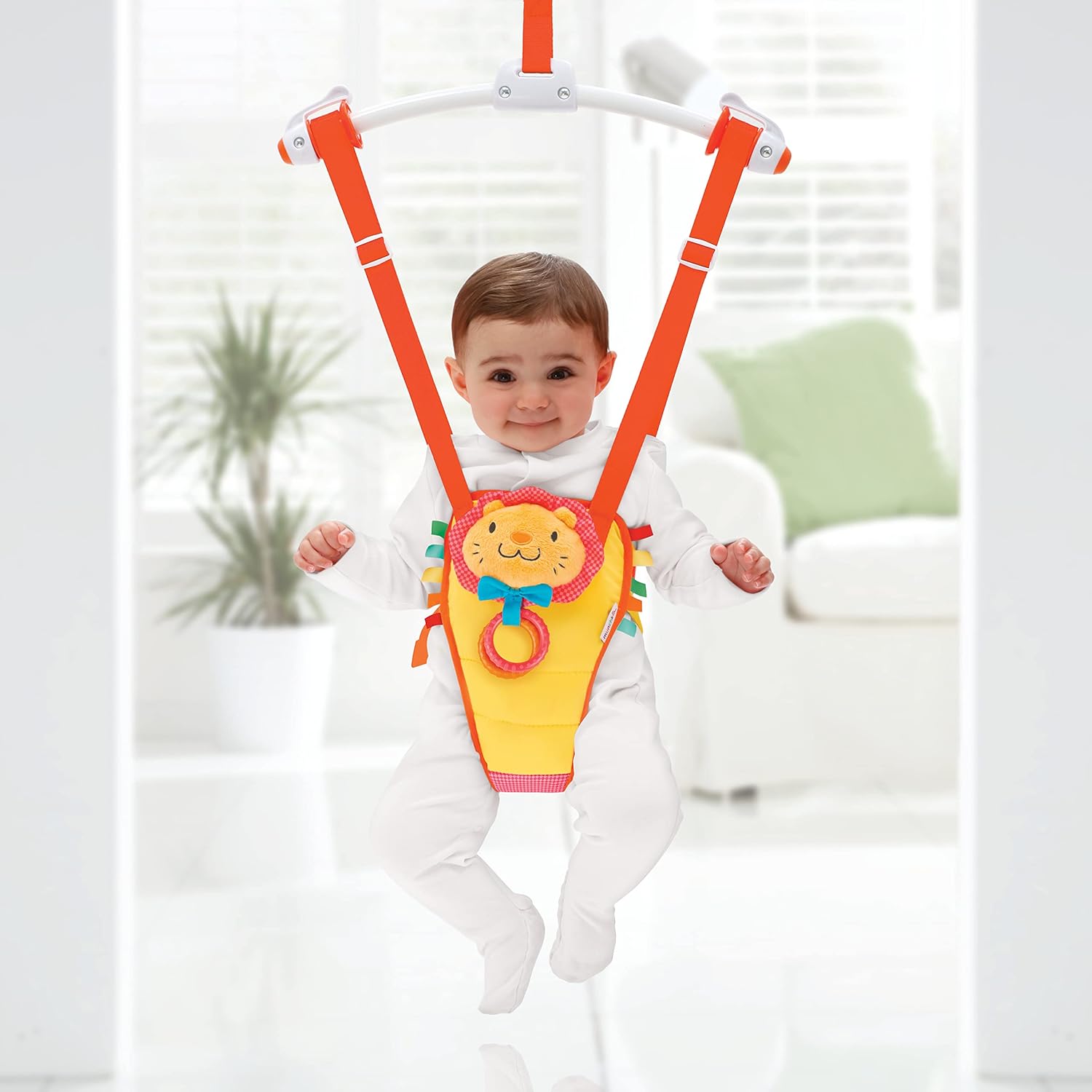 - DOORFRAME BOUNCER SUPPORTS COORDINATION: The baby to toddler bouncer and baby door swing features a colourful baby lion with a crinkle mane, squeaky nose and two baby teething rings