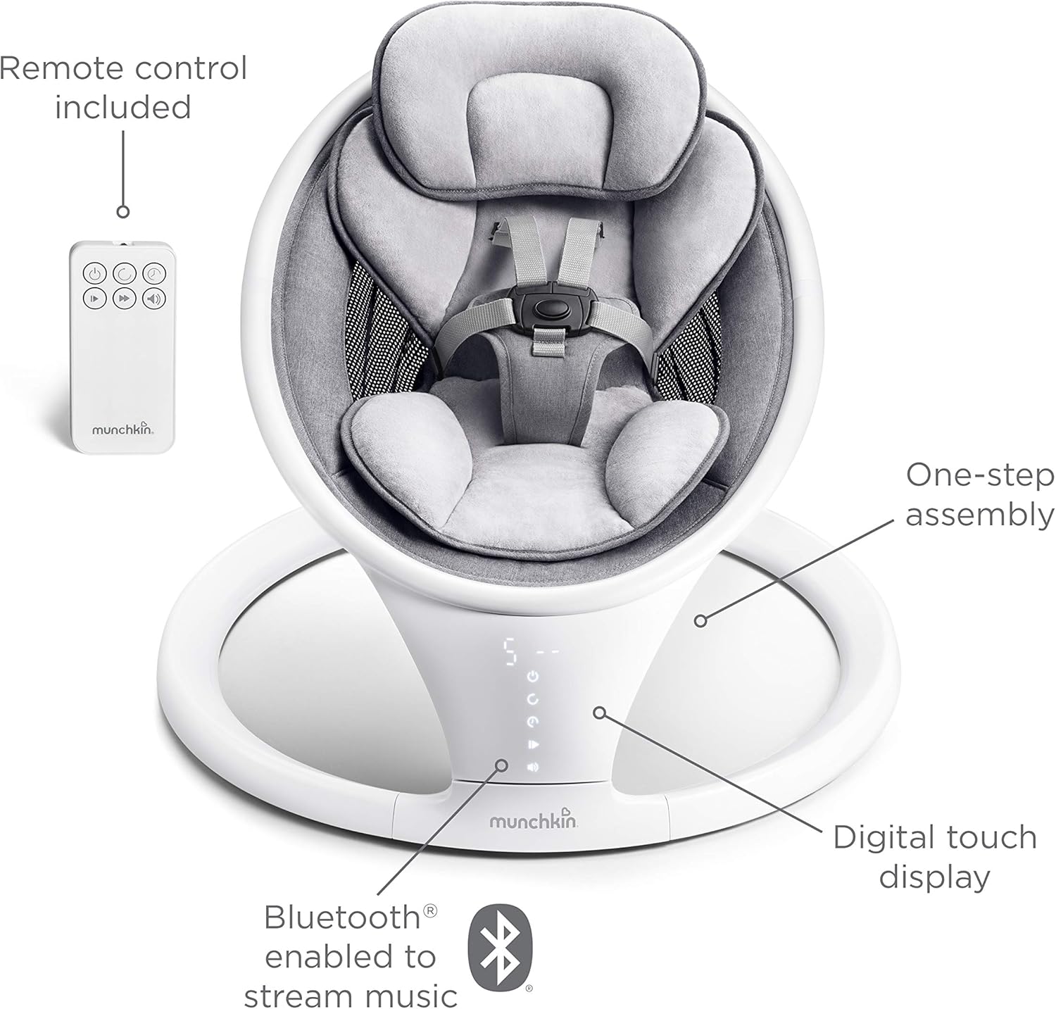 Munchkin Balanço elétrico para bebês | Cadeira de balanço e balanço para bebês com Bluetooth, balanço para bebês com balanço natural em 5 velocidades e controle remoto, Balanço para bebês Munchkin com estrutura de porta de brincar e pula-pula