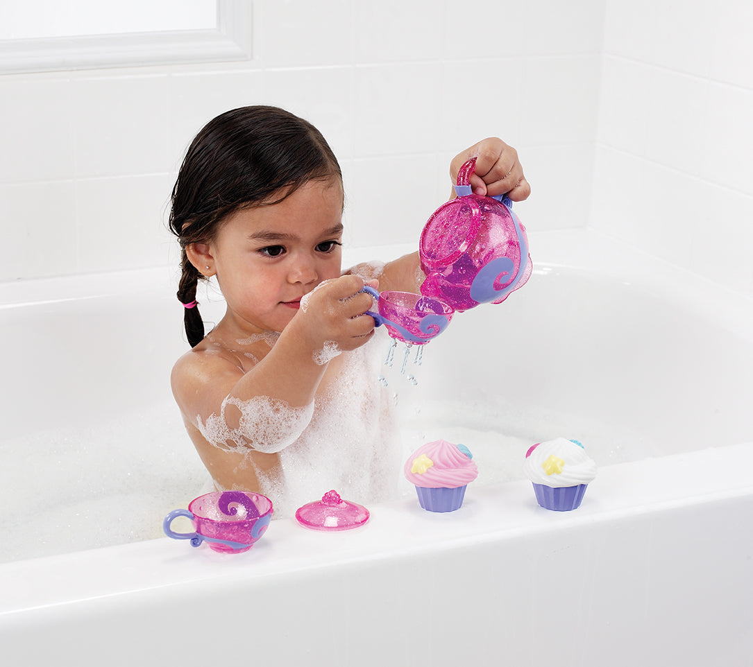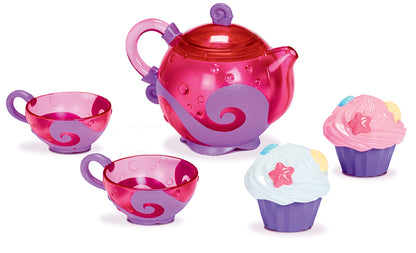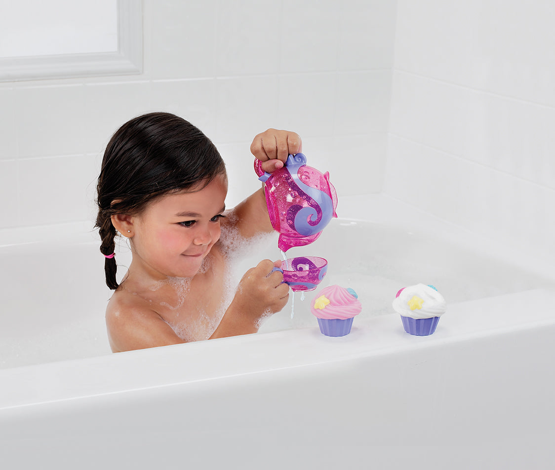 O bule rosa inclui um coador e um chocalho que treme quando vazio. Conjunto também inclui squirters cupcake fosco com granulado de estrela do mar. As xícaras de chá incluem coadores que permitem que a água flua para estimulação visual e vários padrões de jogo. Uma ótima opção de presente para crianças de 2 anos ou mais.