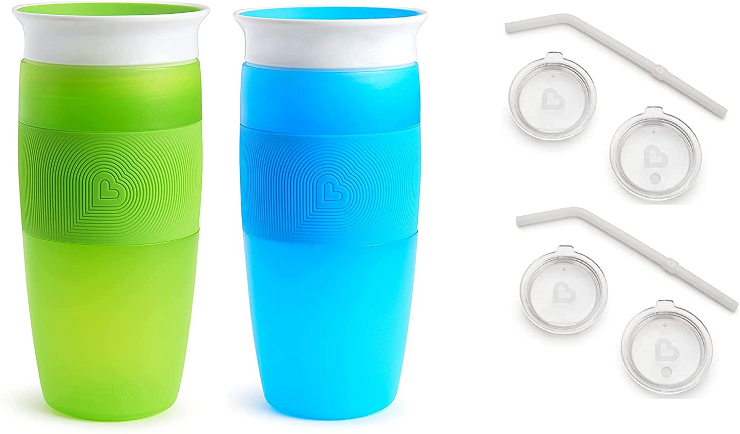 O conjunto inclui (2) copo de milagre de 14 onças para meninos, (2) tampa de sipper e (2) canudo com tampa de canudo